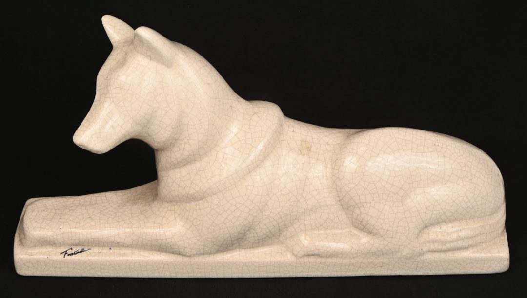 Een herdershond, geglazuurd craquelé aardewerk. Art-deco, gemerkt Fontinelle. Nr. 59.