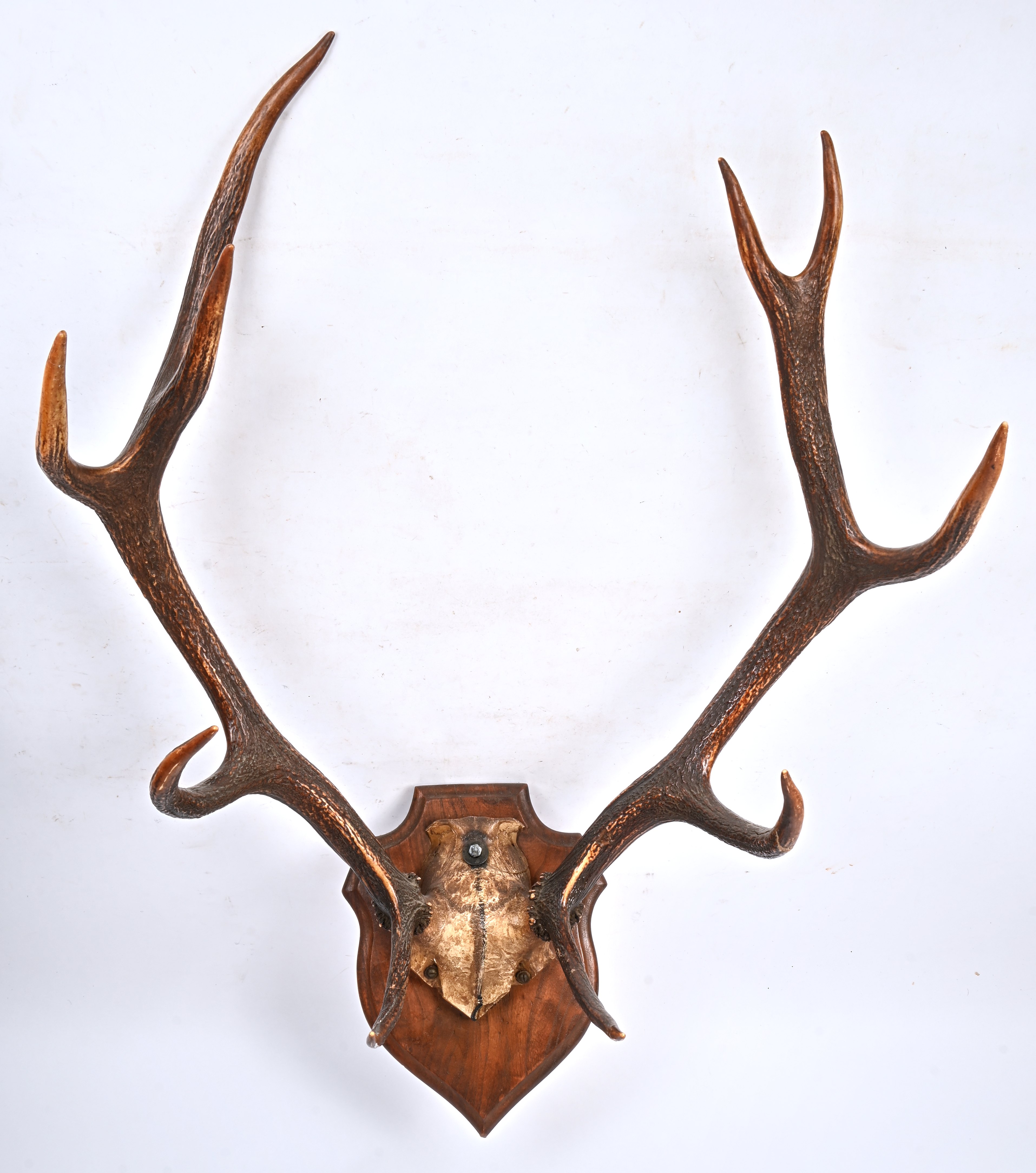 A deer antler, mounted on a wooden shield. Featuring a copper plate with the inscription 'A. G. B. Amlier 16-10-71'. -