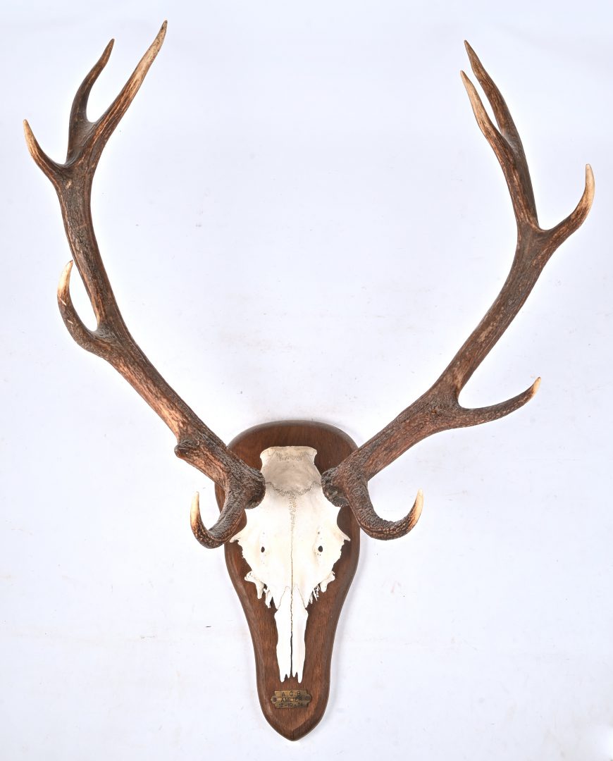 A deer antler, mounted on a wooden shield. Featuring a copper plate with the inscription 'A. G. B. Amlier 16-10-71'. -