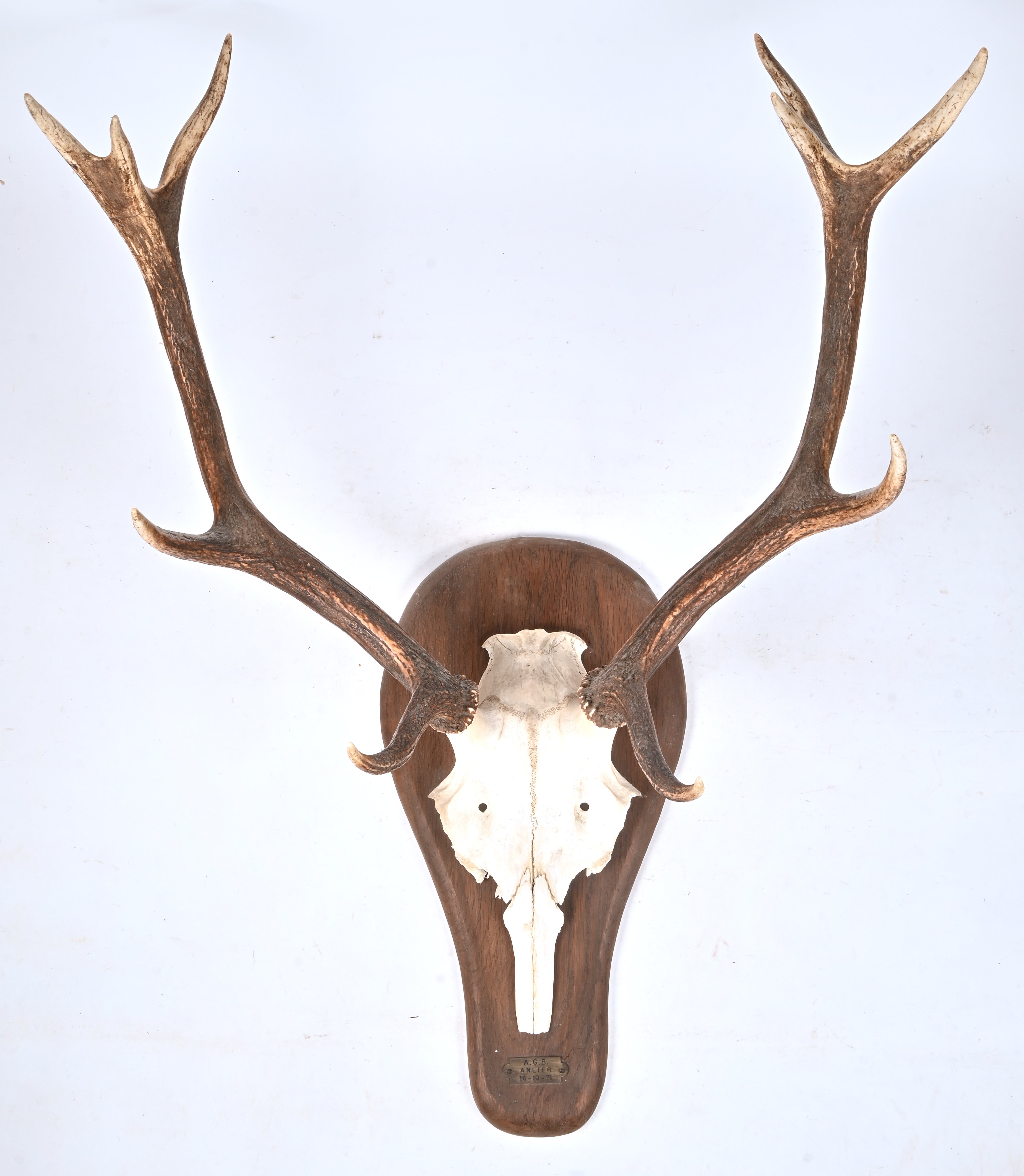 A deer antler, mounted on a wooden shield. It bears a copper plate with inscription 'A. G. B. Amlier 12-10-74'. -