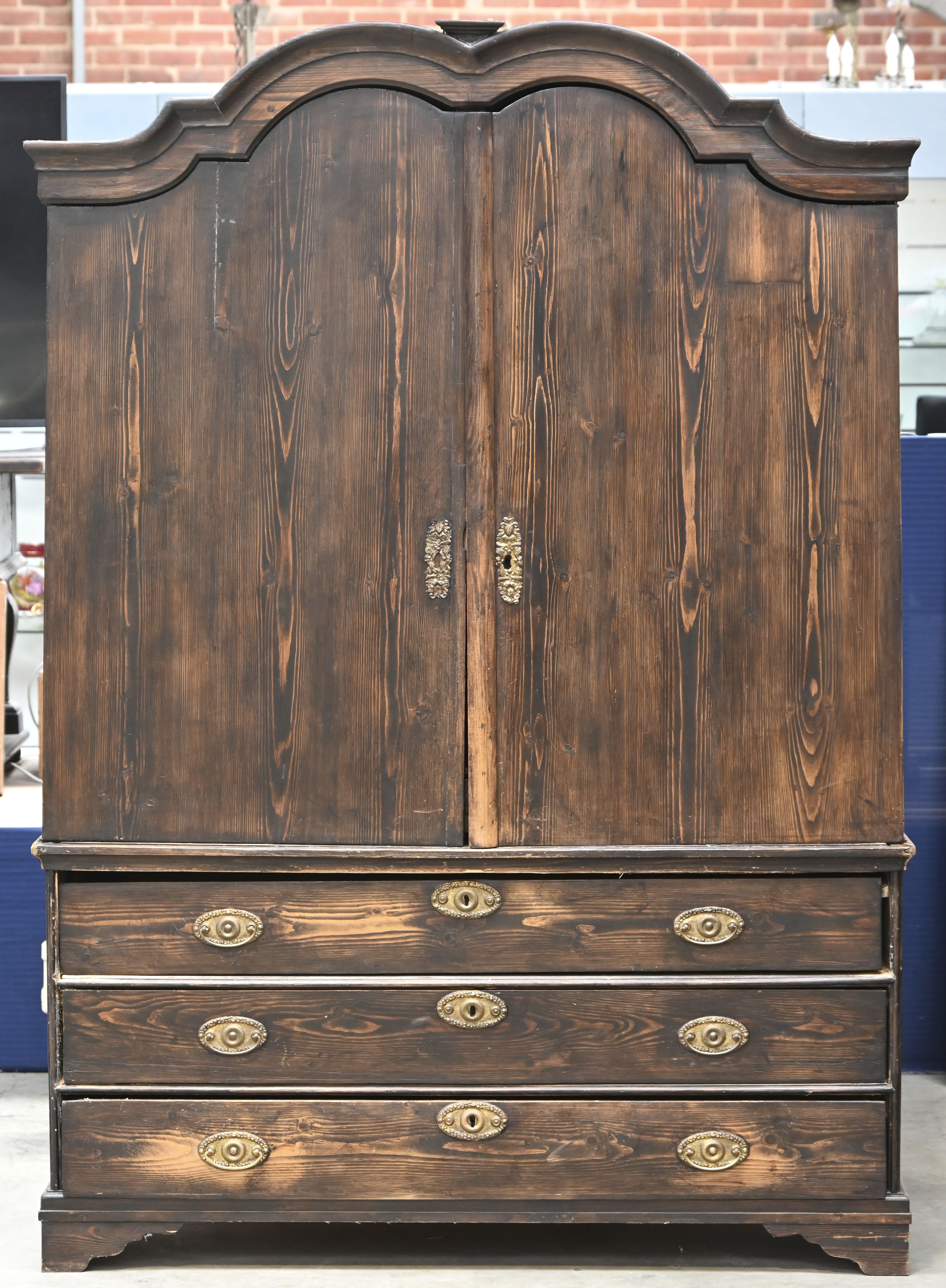 A Dutch (or English) cabinet in Georgian style with two doors and three drawers, on bracket legs. Circa 1800.