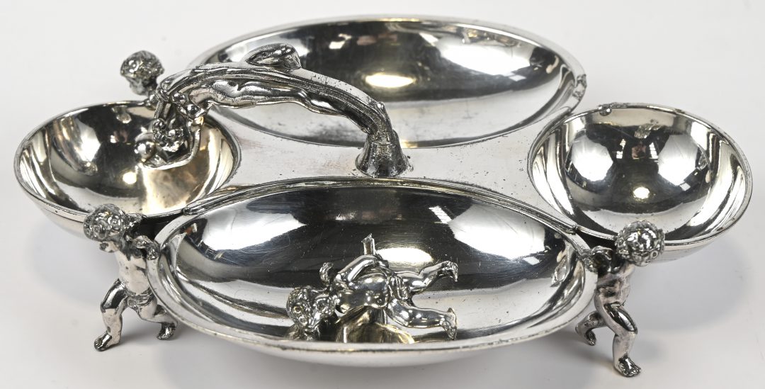 Een hors d’oeuvreschaaltje met drie coupes, gedragen door putti en handvat in de vorm van een naakt. Eén putto opnieuw te solderen. AR19