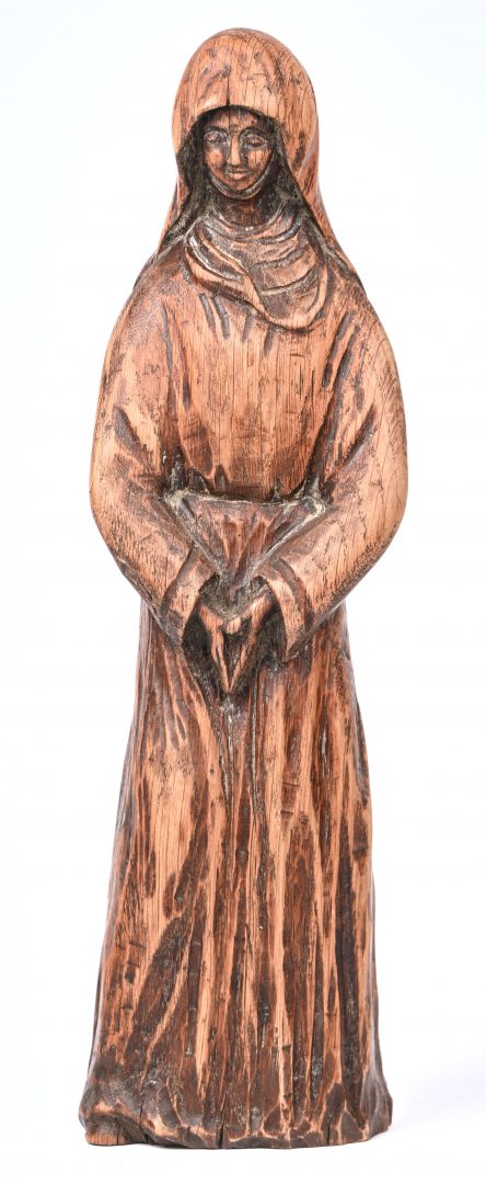 A wooden statue of a pious Beguine. Not signed.