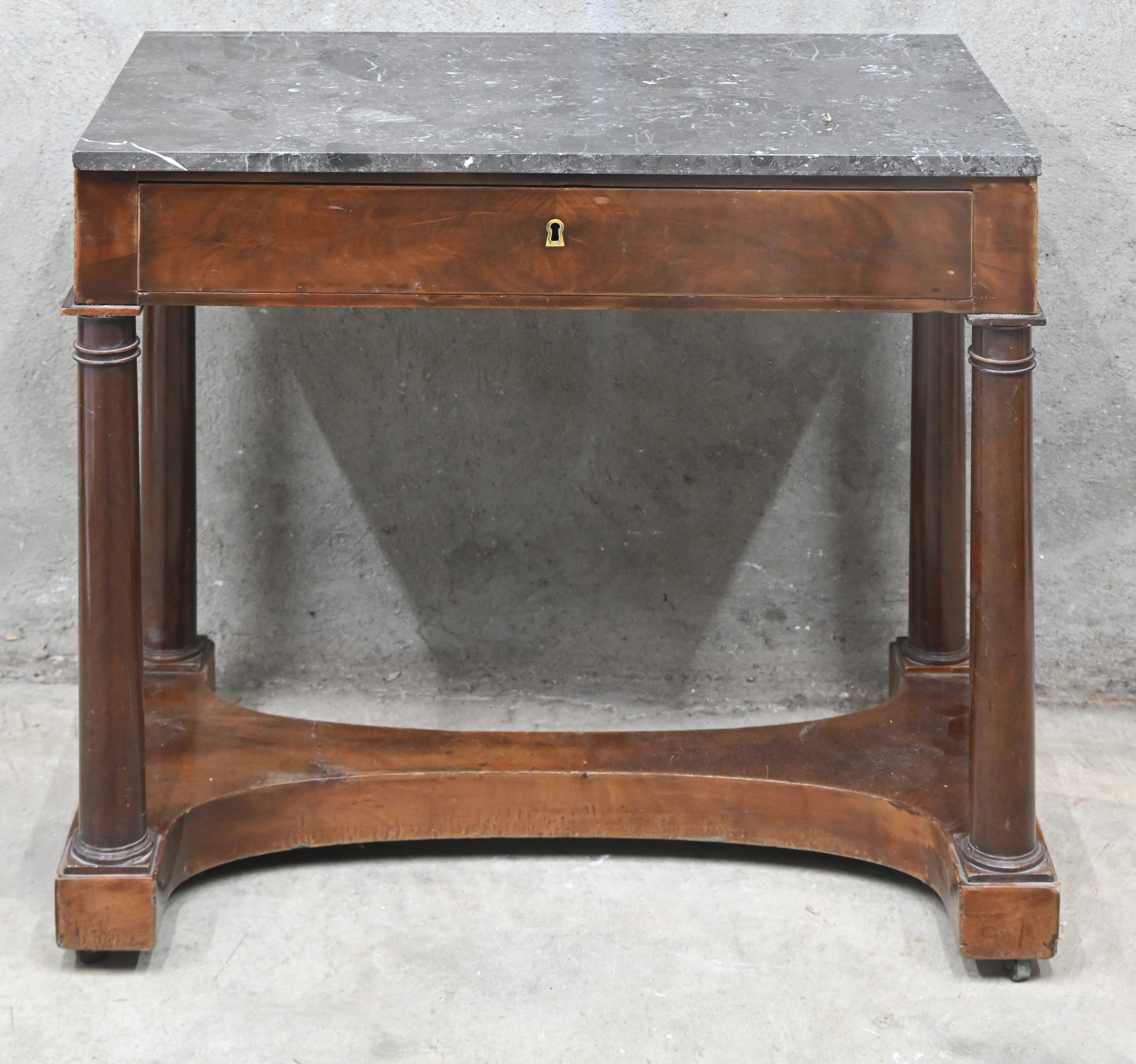 Een houten consoletafel met één lade en een arduinen blad, in Empirestijl.