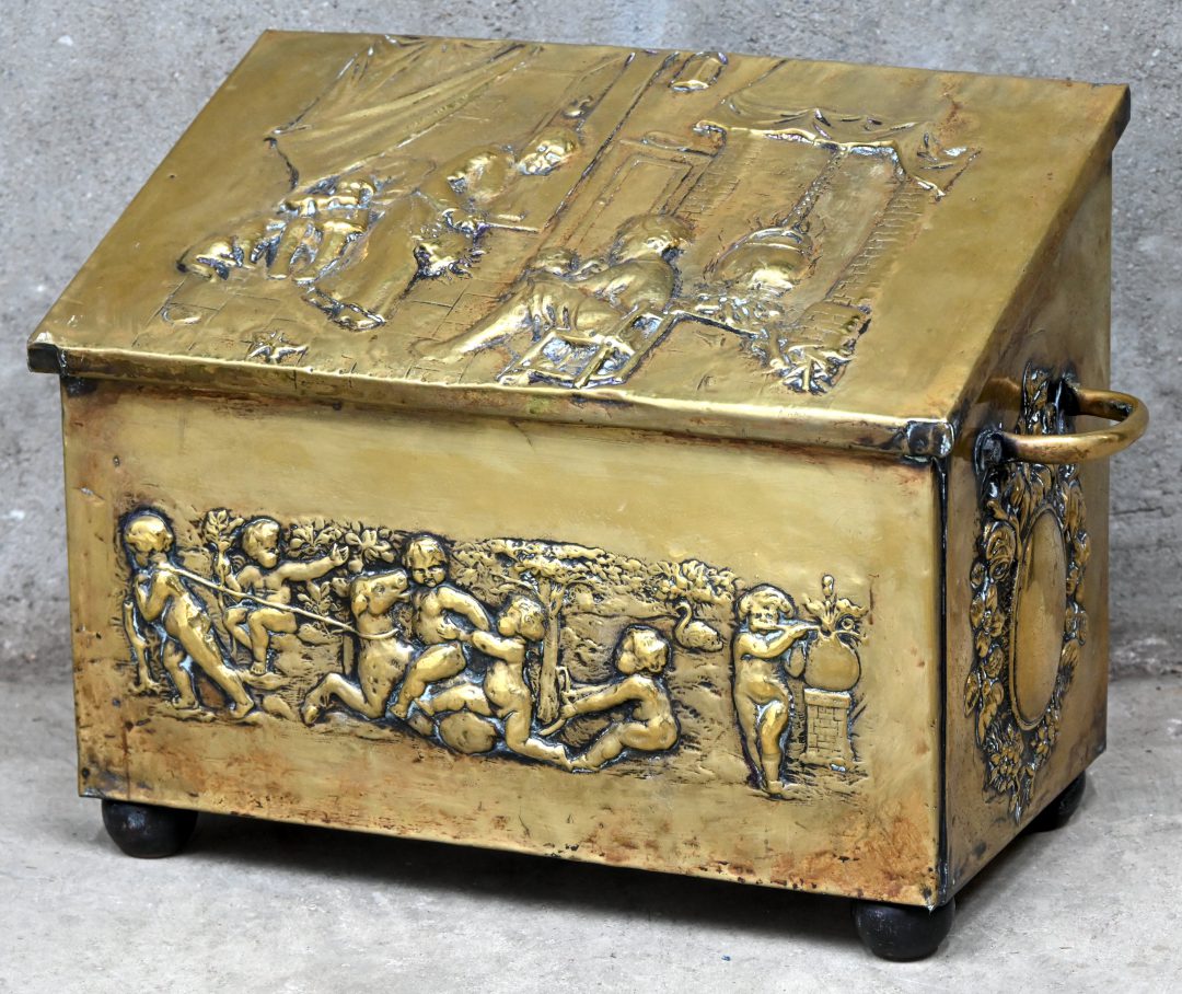 Een houten koffer met een huiselijk tefereel en putti in Dinanderie.