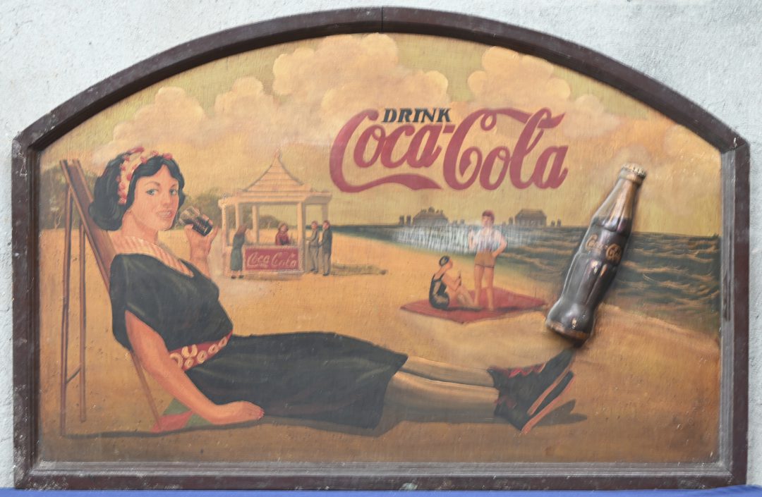 Een houten reclame paneel naar de oude reclames van Coca Cola.