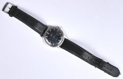 #390Omega GenèveEen vintage Omega heren horloge met stalen kast en lederen polsband.
