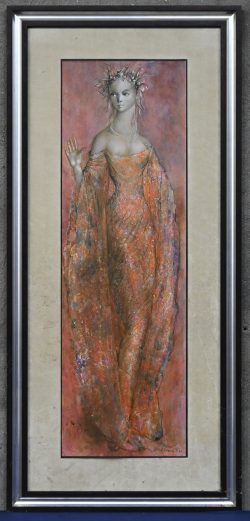 #196‘Vrouw in oranje jurk’, een ingekaderde prent naar het werk van Leonor Fini.