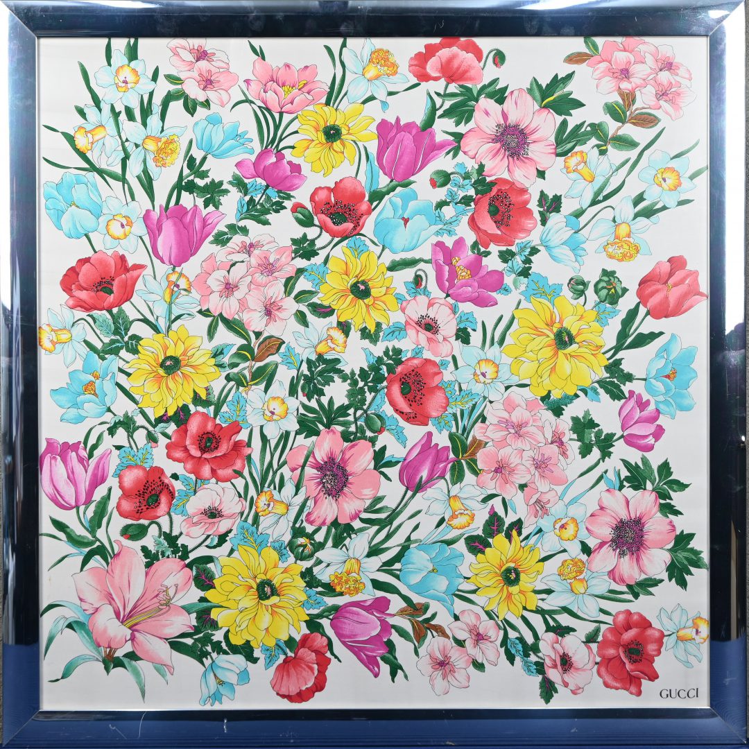 A framed silk Gucci scarf with floral print.No longer availableDim. 77/77 cmEstimate: € 80 / 120 -
