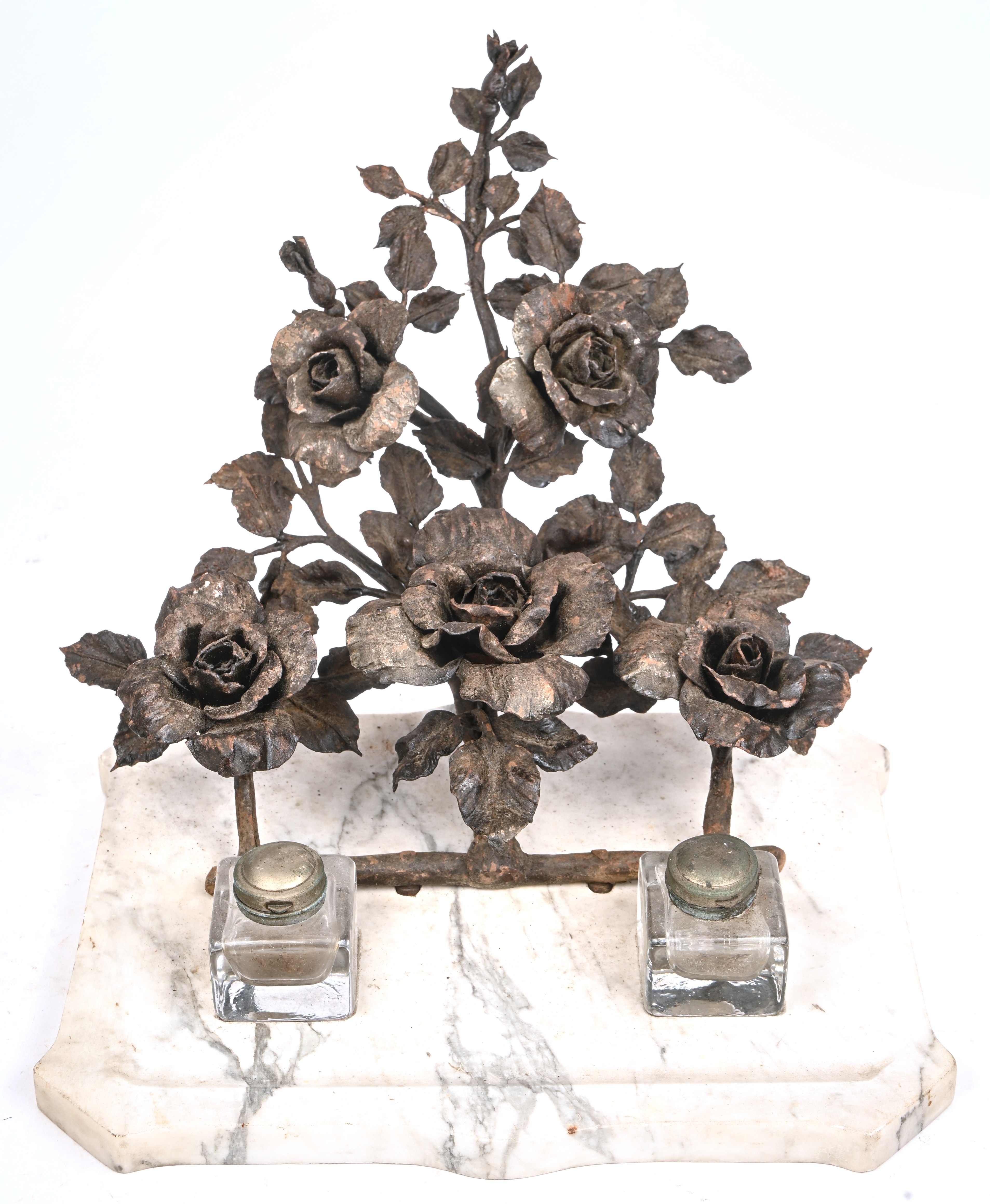 Een inktstel met smeedijzeren rozentak in de stijl van Van Boeckel. Op een witte marmeren voet, met twee inktpotten.