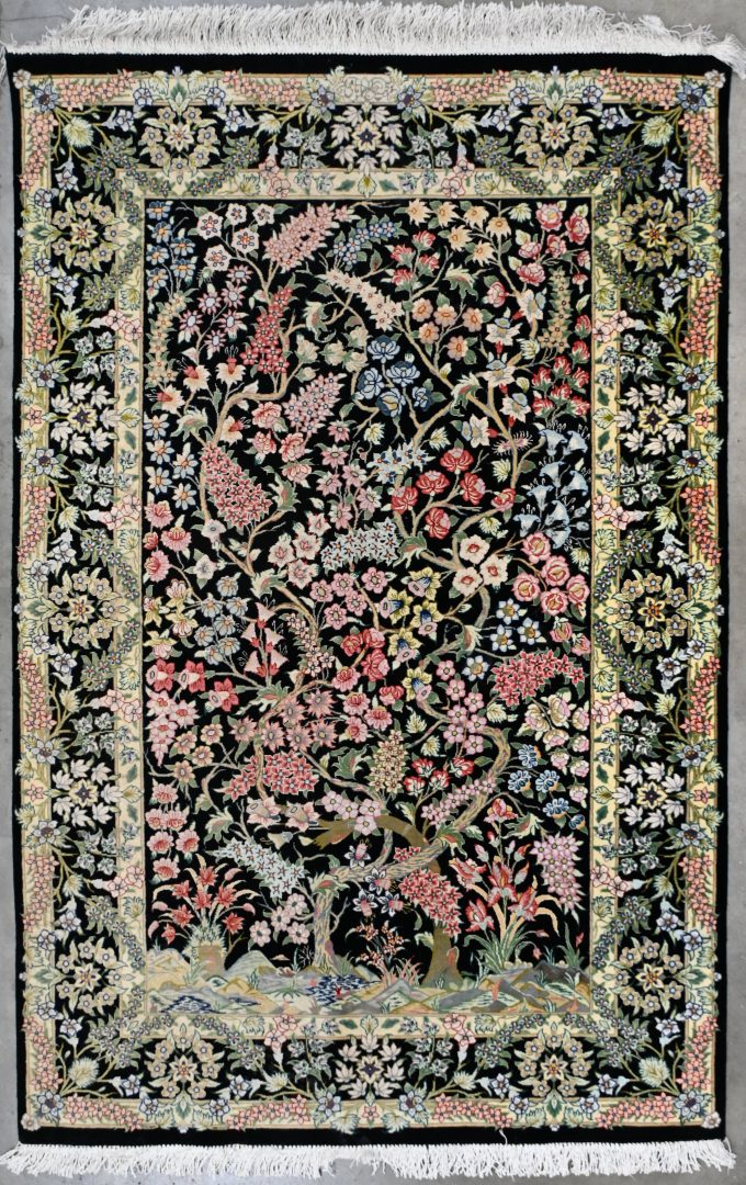 An Iranian hand-knotted silk Ghoum carpet. -
