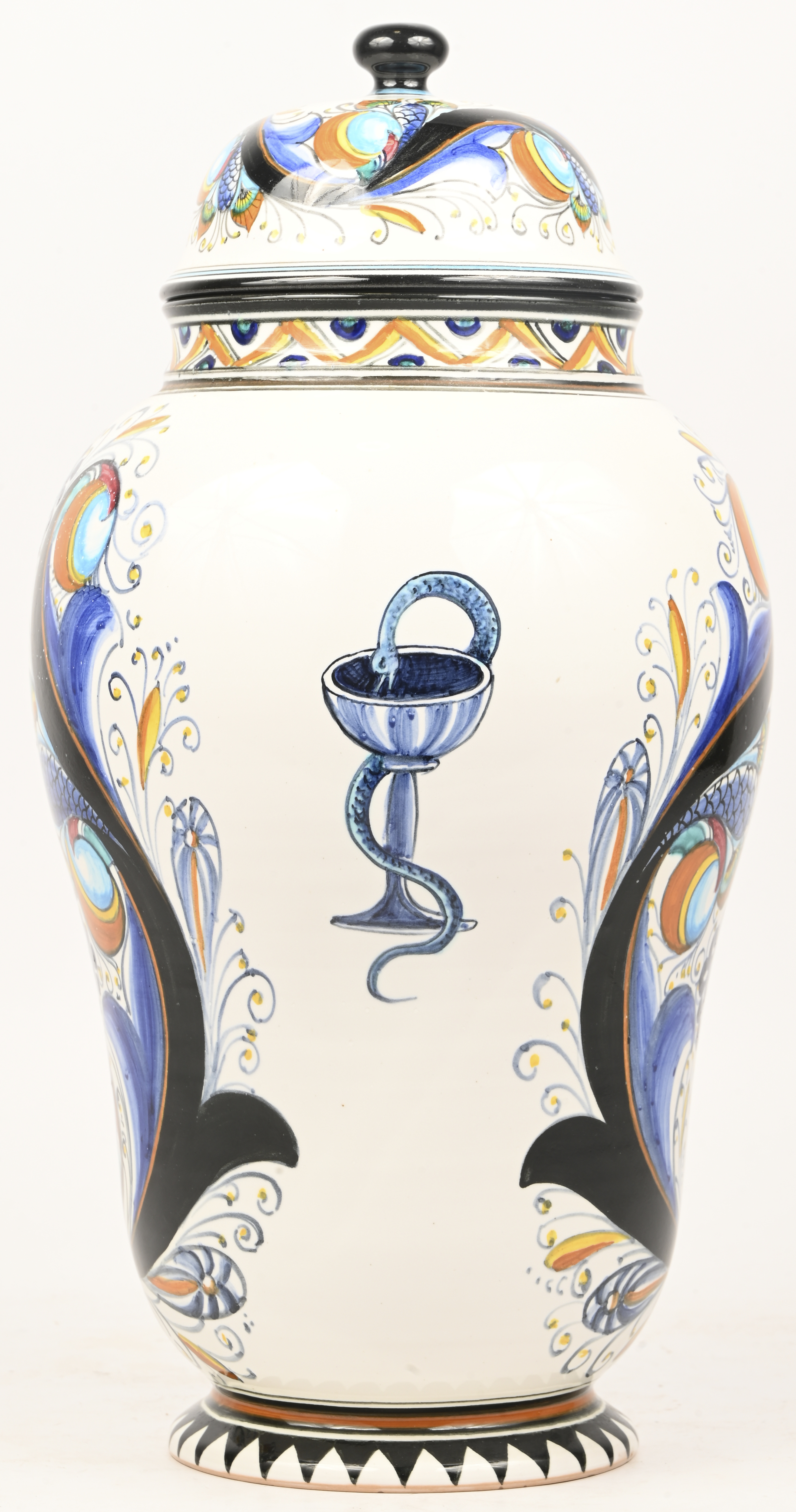 A set of multicolored Delft earthenware with floral decoration consisting of 3 covered vases, 2 with hairline cracks, a dish, and an ashtray. -