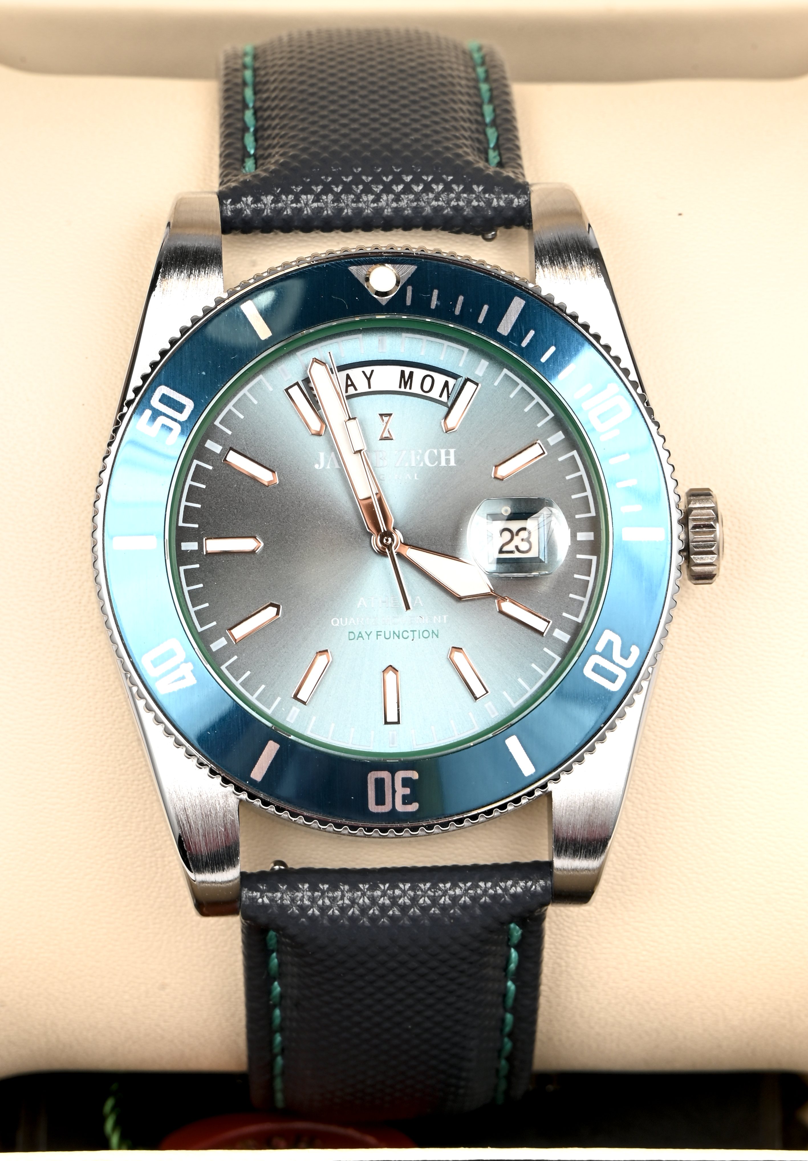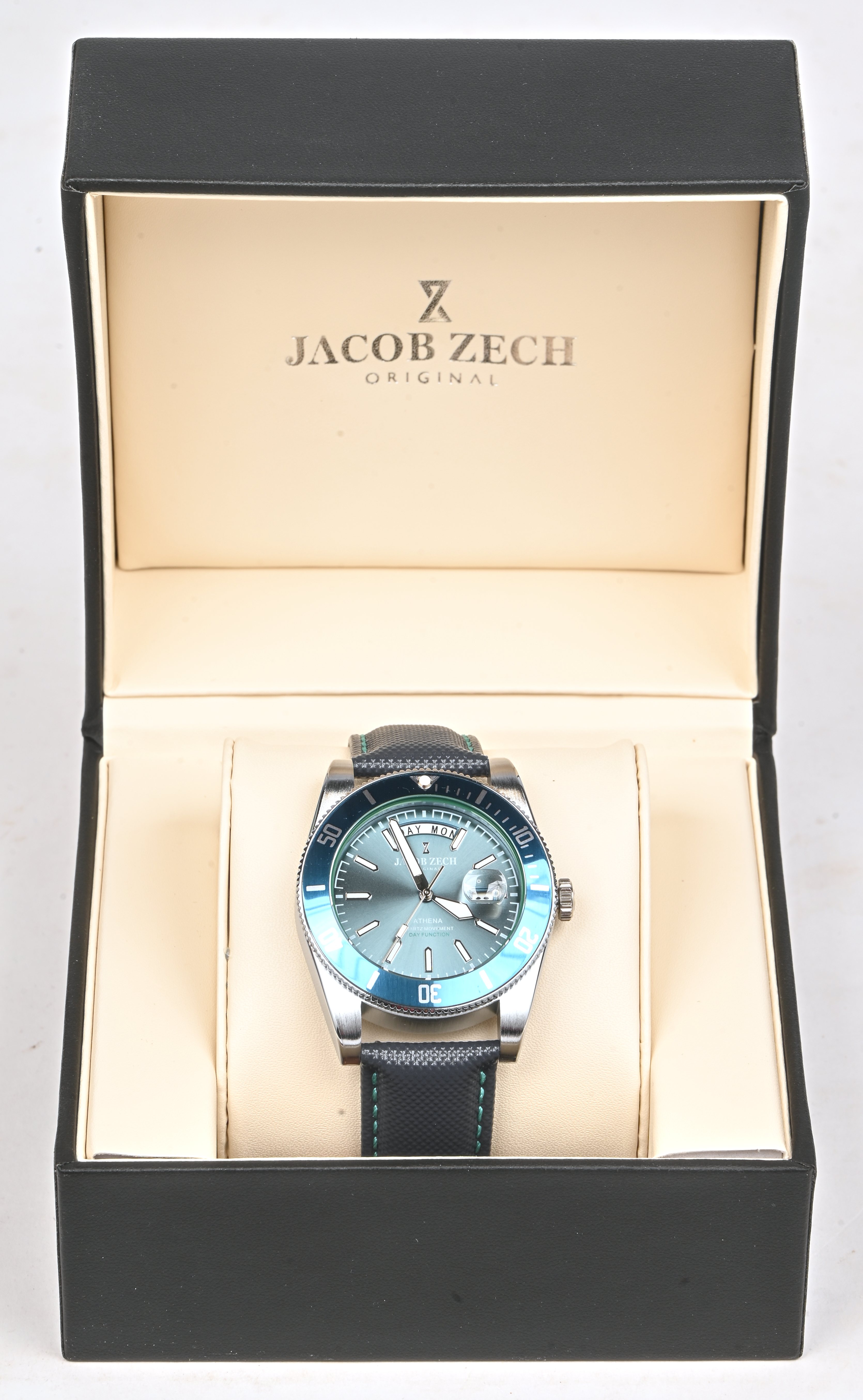 A Jacob Zeich wristwatch model 'Athena', with calendar and day indication. In mint condition, with original packaging.No longer availableDim. Ø 42 mmEstimate: € 50 / 80 -