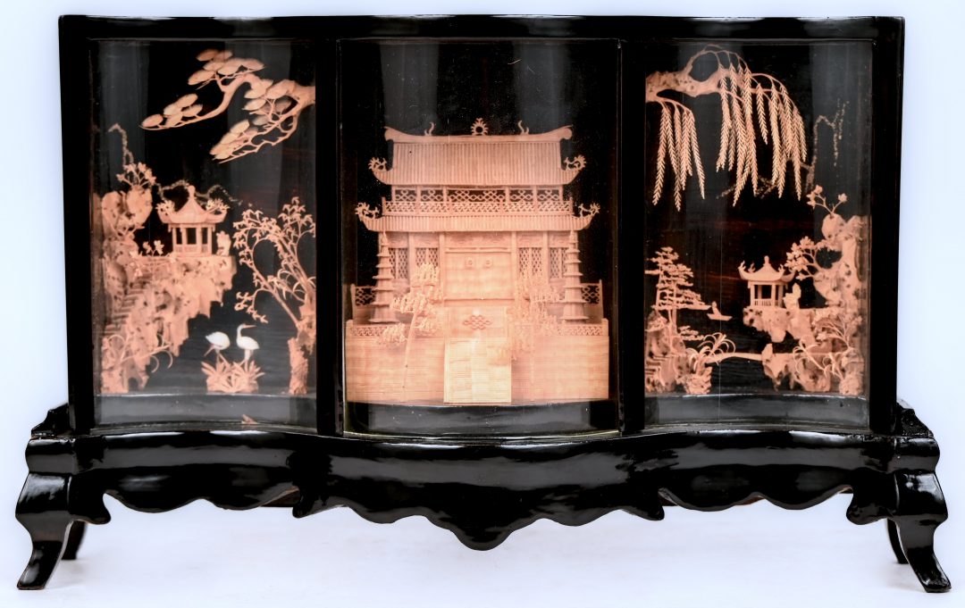 #237Een Chinees tafereel in vitrinelijst, opgebouwd met schelpen.