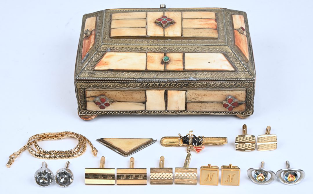 Een juwelendoosje van koper en been, gevuld met een dasspeld met een stierenvechter, zes paar fantasie manchetknopen en een schakelhalssnoer.