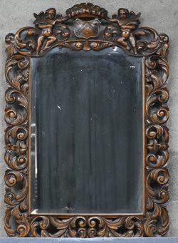 #24Een spiegel met gesculpteerd houten frame, neo-klassiek met wapenschild en twee cherubijnen.