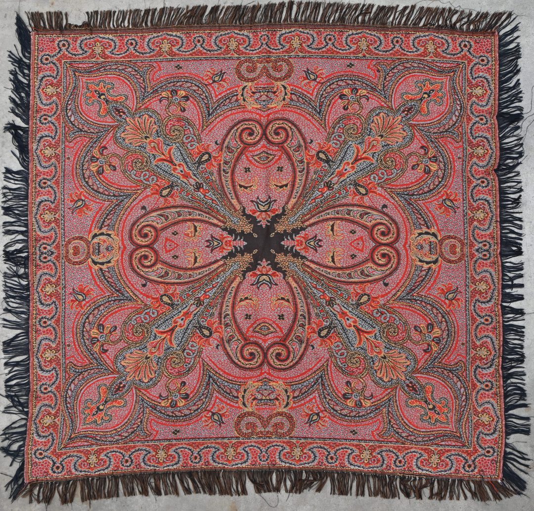 A Kashmir wool and silk shawl. Red, blue, green, and gold.