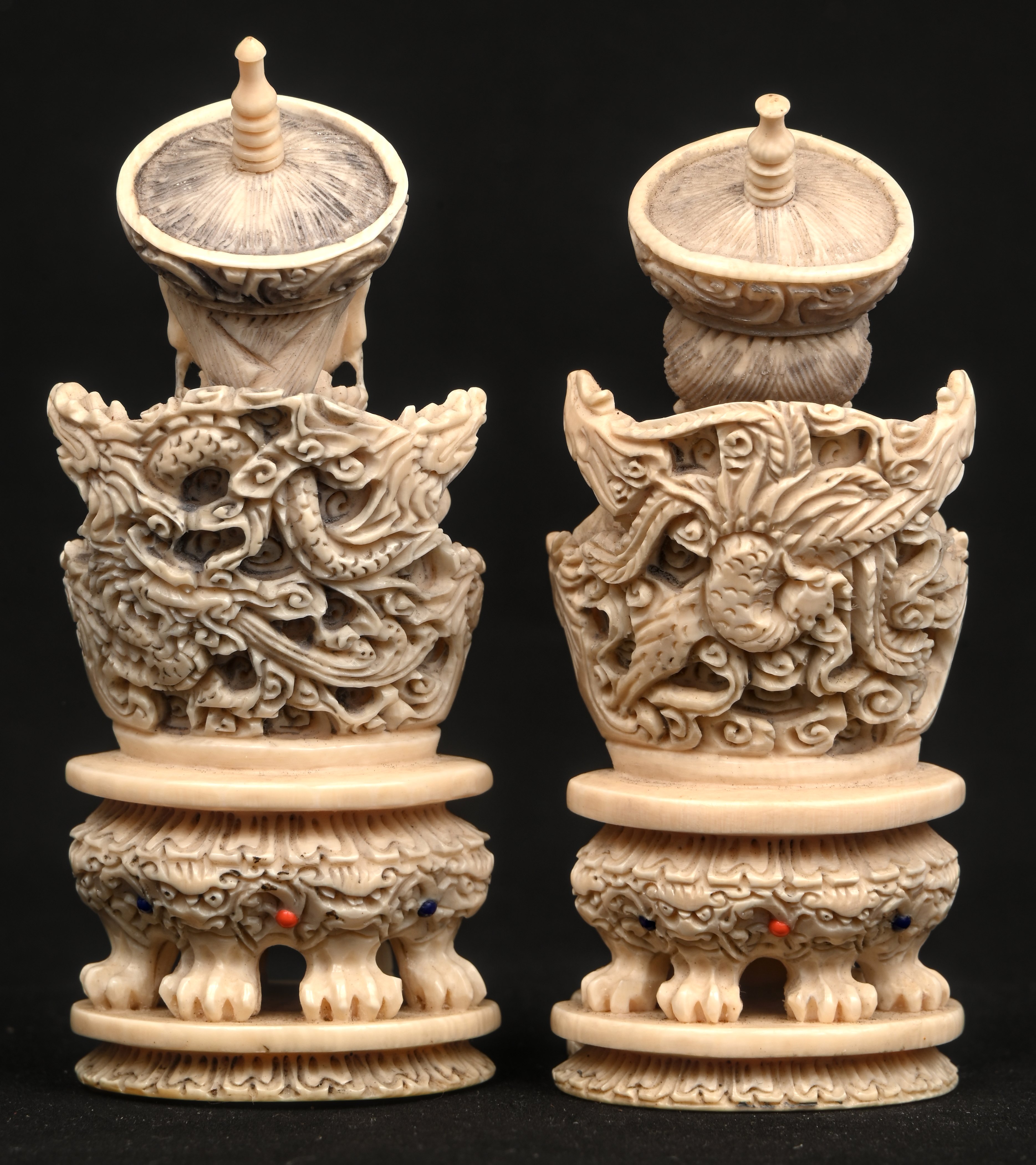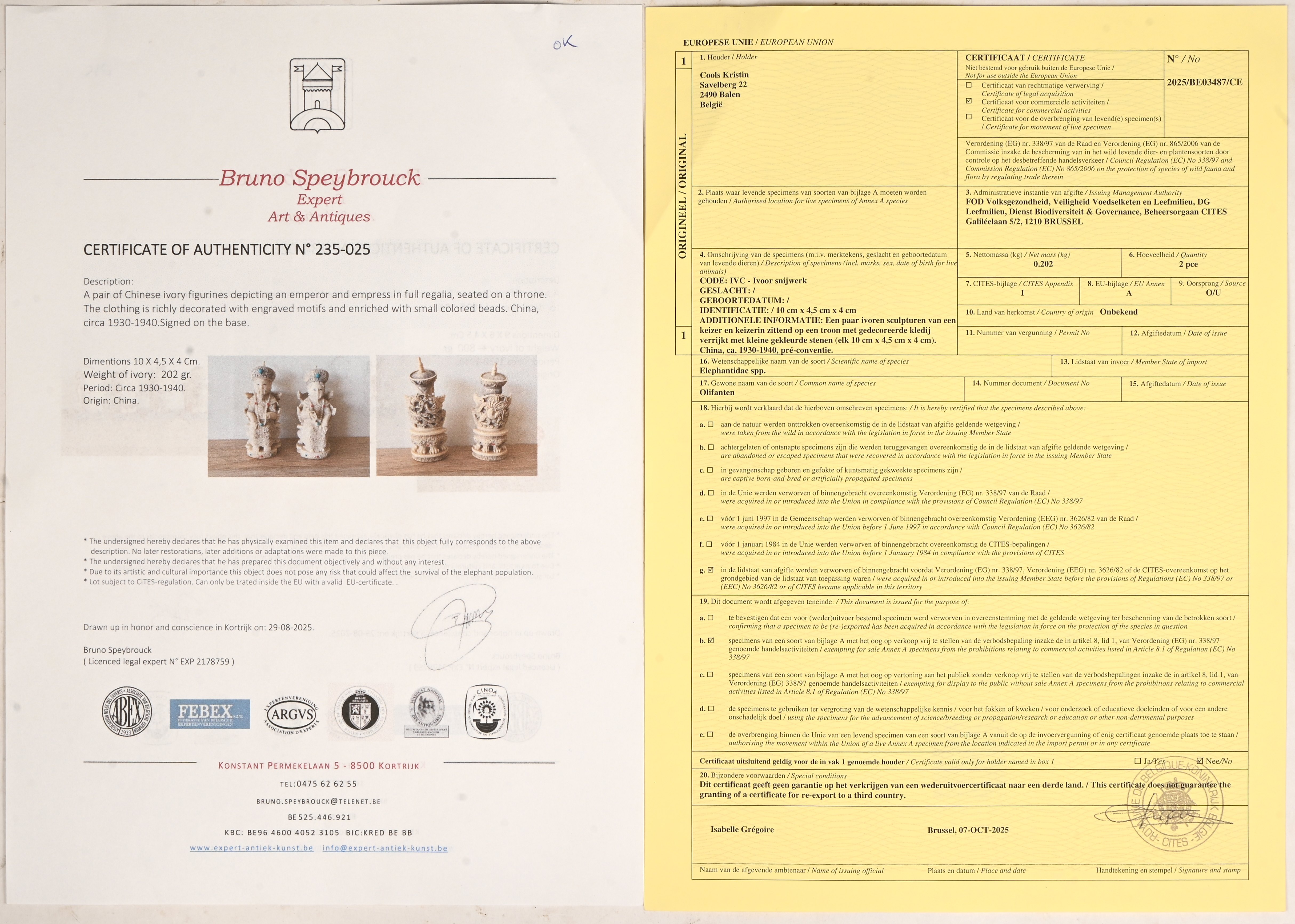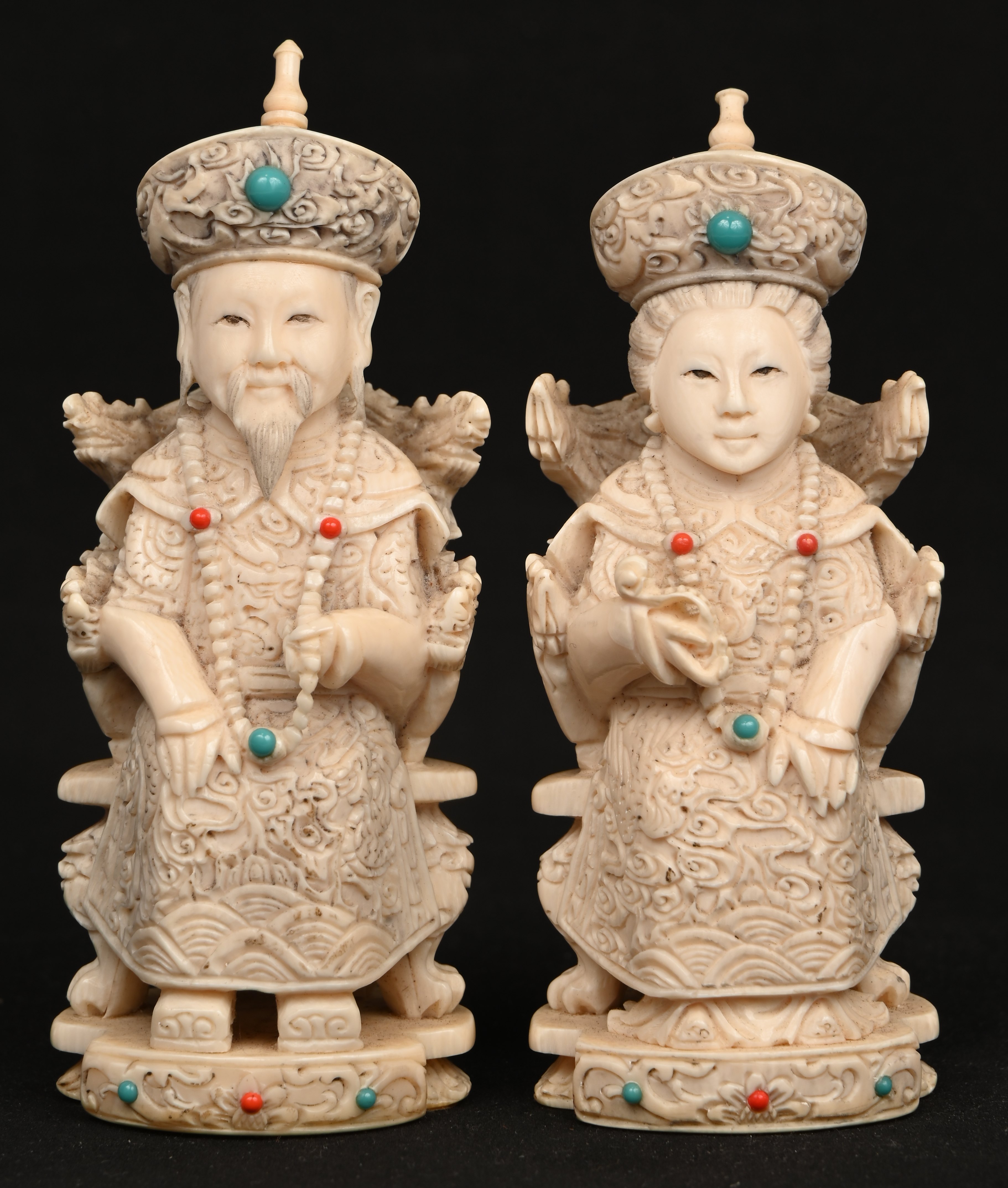 Een keizer en een keizerin van Chinees ivoor. Gegraveerd en versierd met kleine gekleurde pareltjes. Onderaan gesigneerd. Met Citesattest.