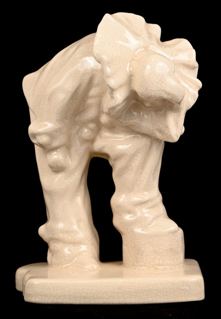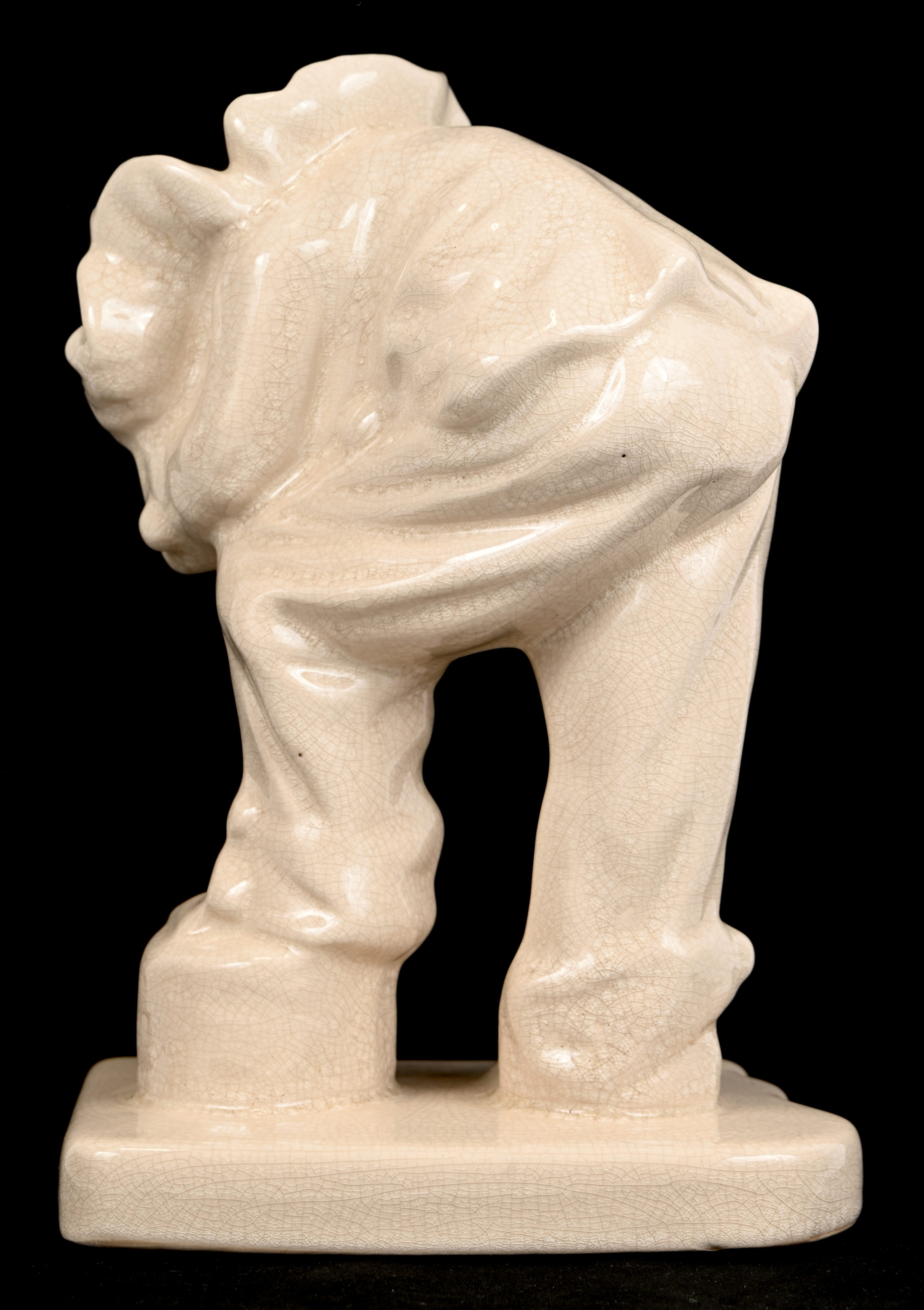 Een keramisch art-deco beeld van een buigende Pierrot in craquelé. Gemerkt Emaux de la Louviere.