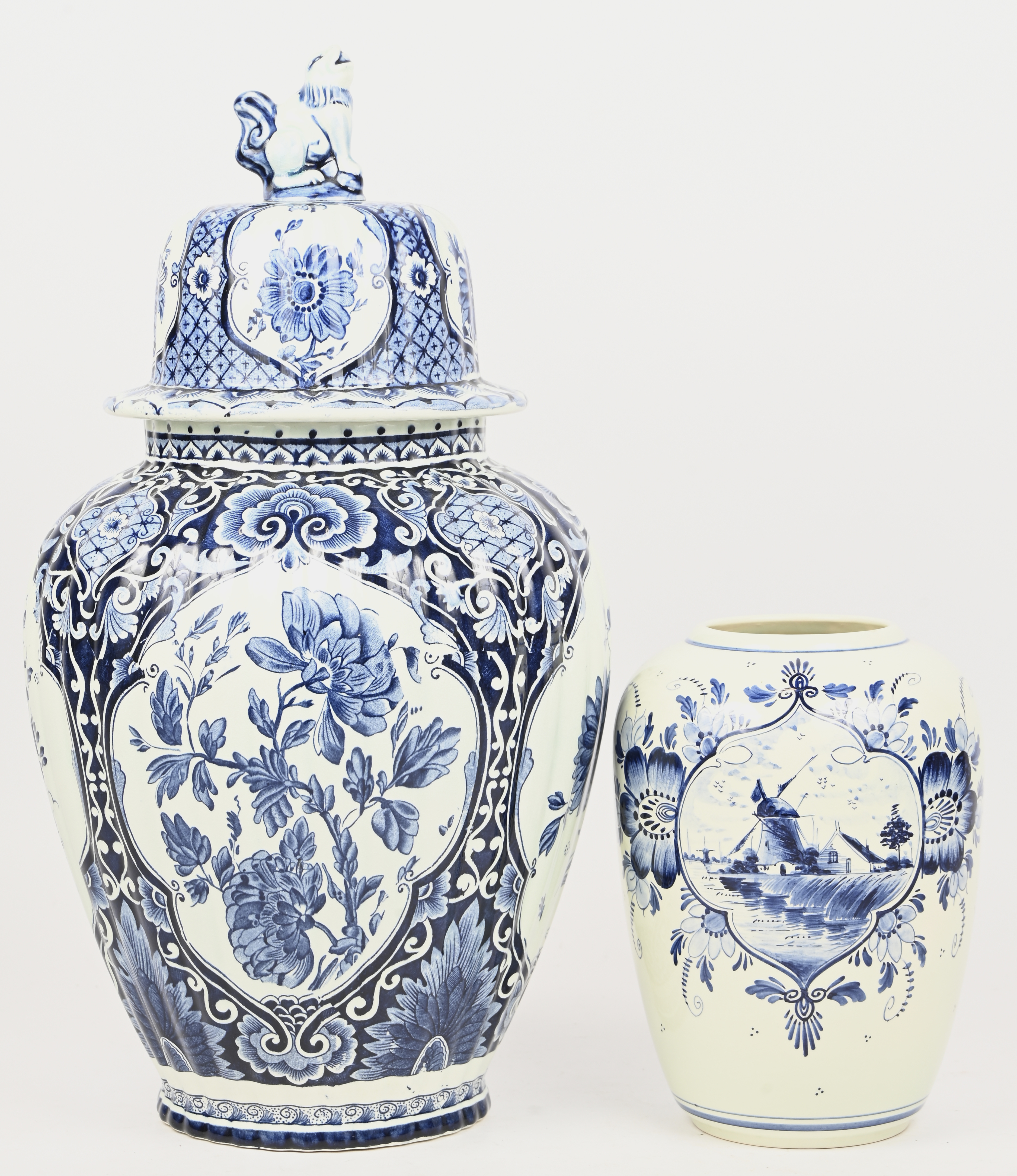Een gevarieerd lot blauw-wit aardewerk en porselein. Bestaande uit 3 vazen, een kruikje, een terrine, tabakspot en een langwerpig doosje met geperforeerd deksel.