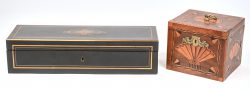 #36Een lot van twee houten kistjes. Zwart met koperen inlegwerk en een gemarqueteerd.