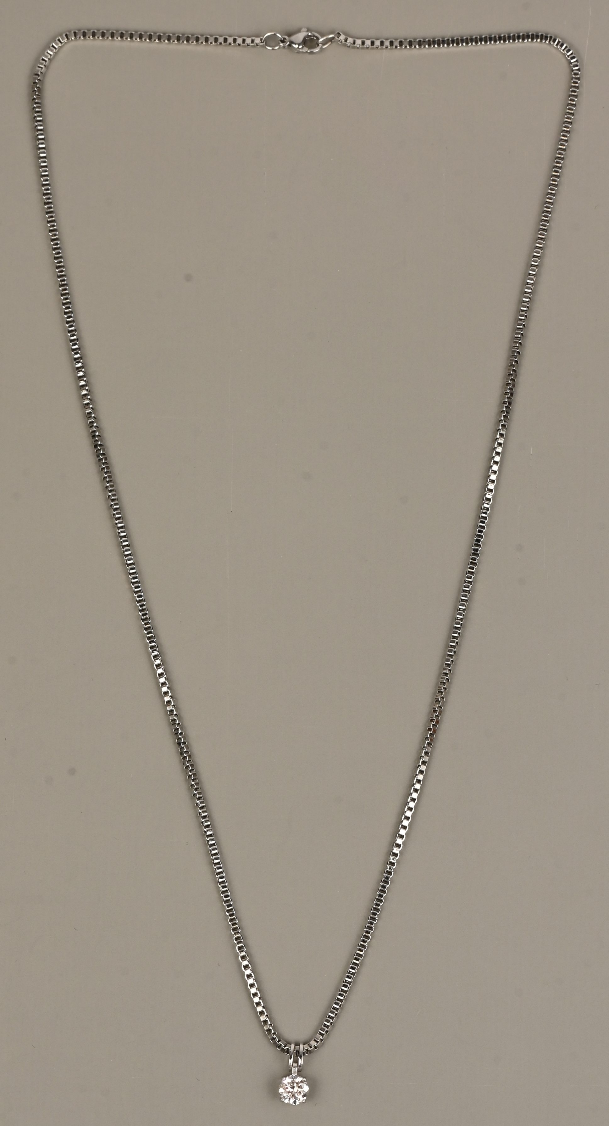 Een ketting en hanger van edelmetaal bezet met een labo diamant van +- 1,15 ct. VVS 2.