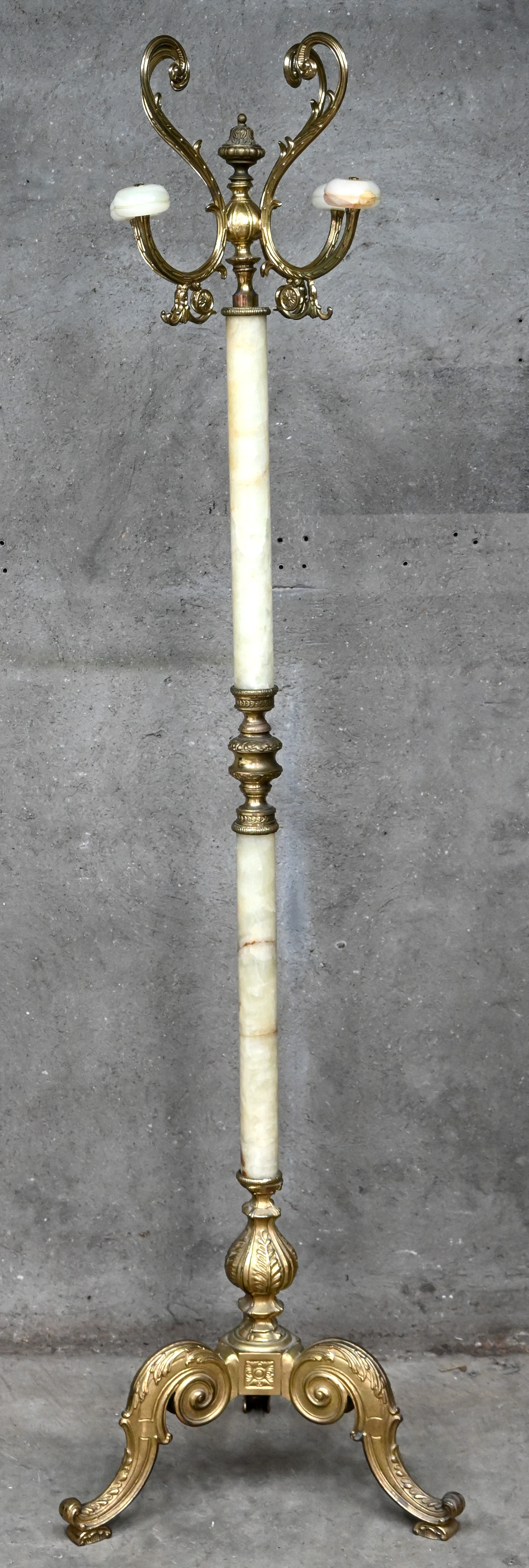 #213Een verguld koperen kerkkandelaar, rijkelijk gedecoreerd.