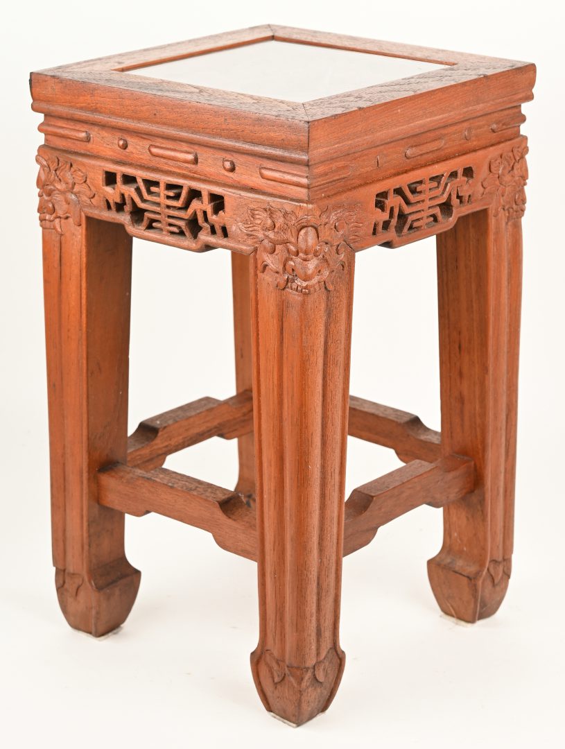 Een klein Chinees houten sokkeltje met gesculpteerd decor in het blad onder glas en drakenkoppen op de hoeken.