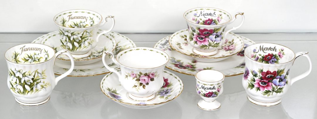 Een klein lotje Royal Albert bestaande uit 5 kopjes, drie schoteltjes, twee bordjes en een eierdopje. Eén kopje heeft een haarlijn.