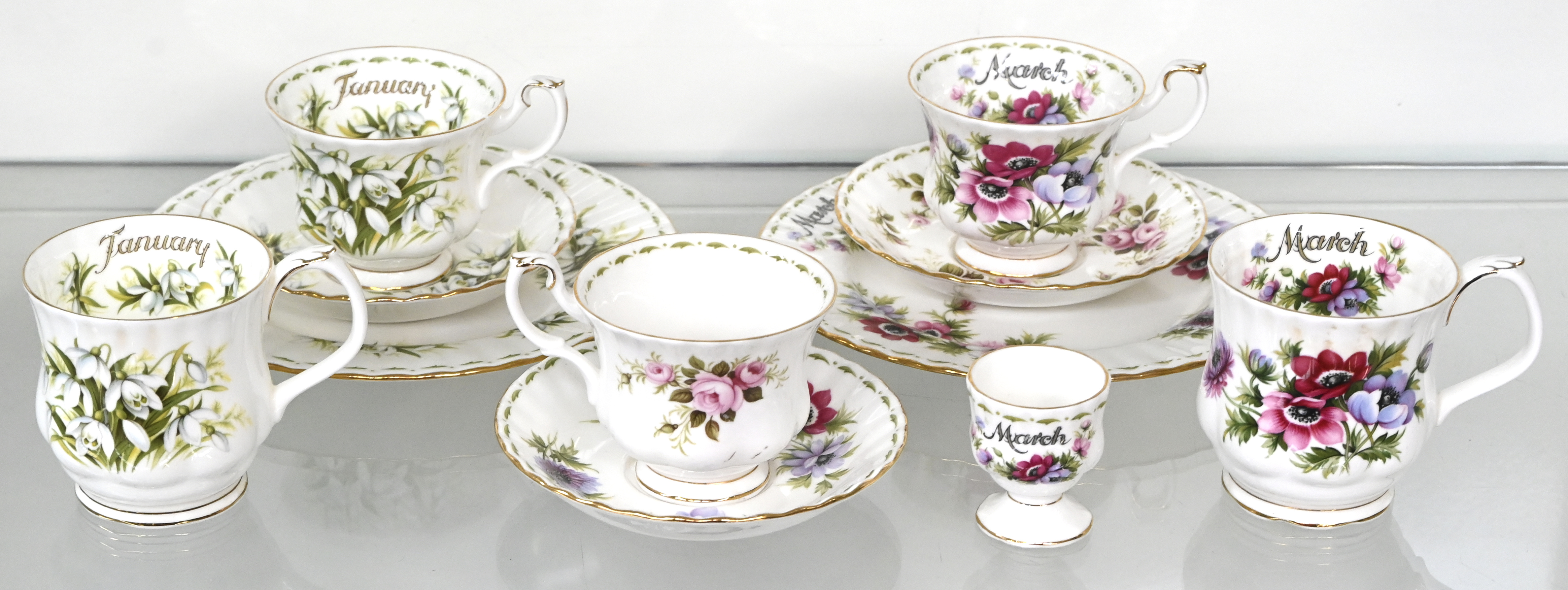 A small lot of Royal Albert consisting of 5 cups, 3 saucers, 2 plates, and an egg cup. One cup has a hairline.