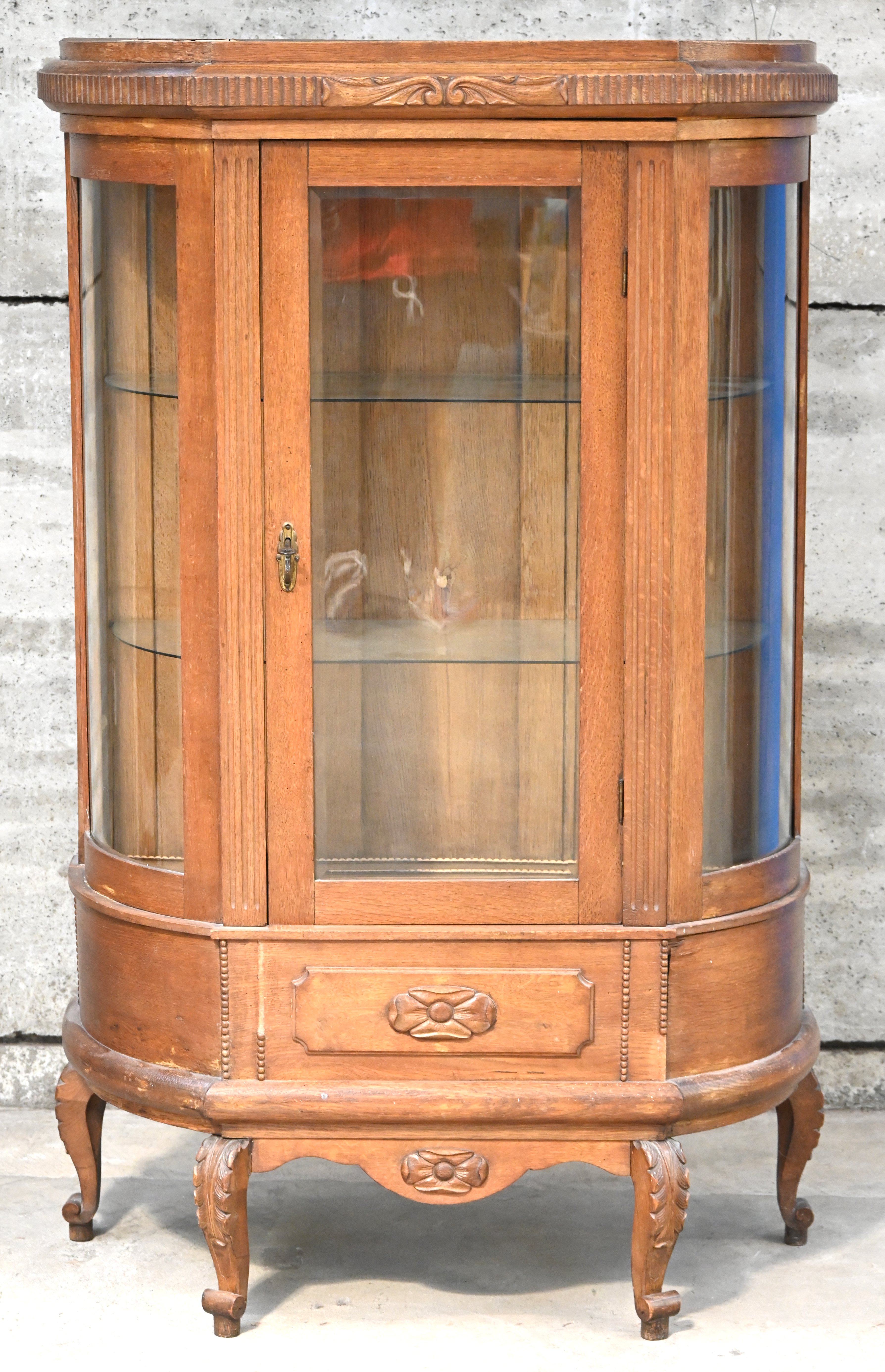 A small display case inspired by the Louis XIV style. Features curved glass sides and one glass door. (top vineer damaged).