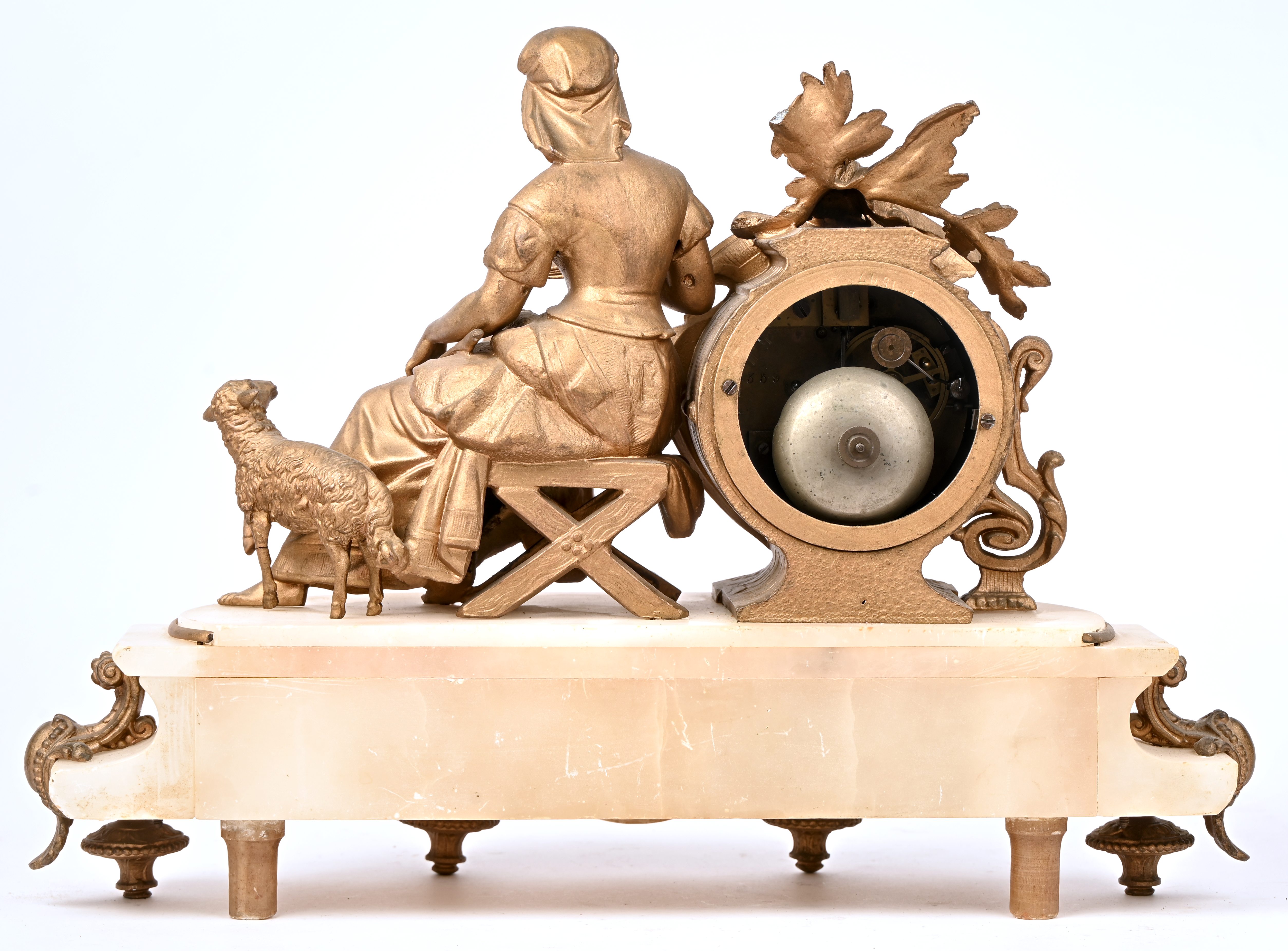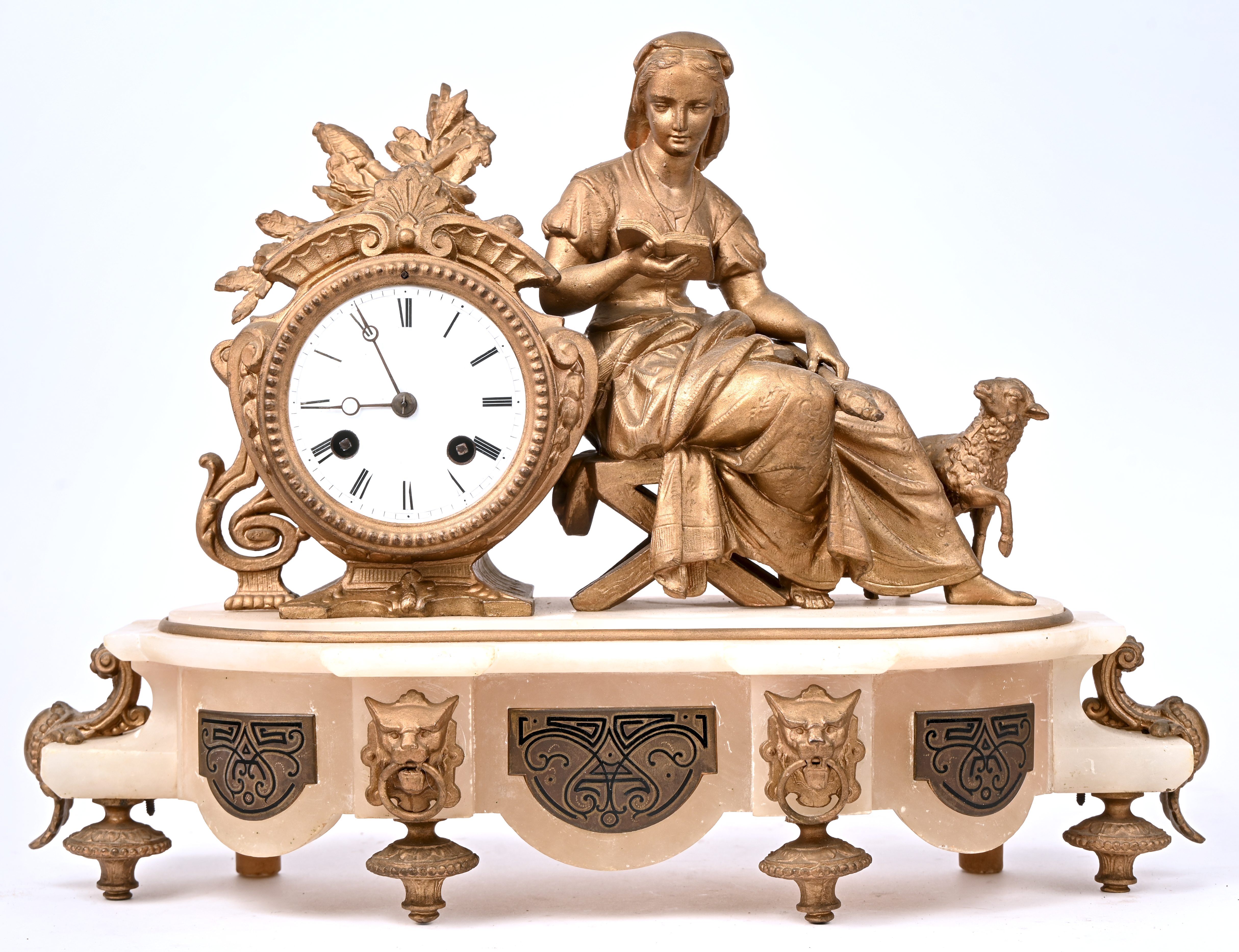 A clock with a gold-colored zamak figure of a reading lady on an alabaster base.