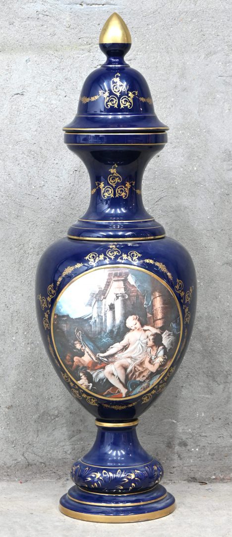 Een kobaltblauwe porseleinen dekselvaas met romantisch tafereel en afwerking in goudverf in de geest van Sèvres.