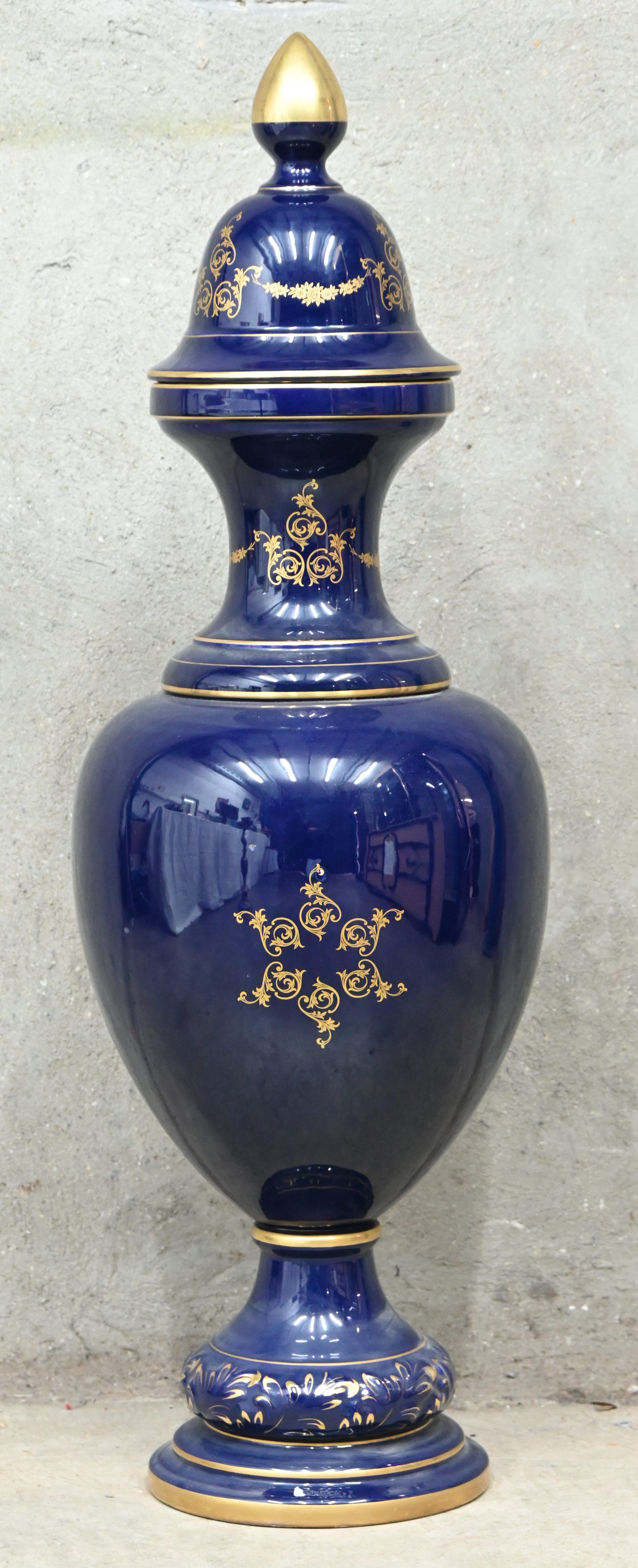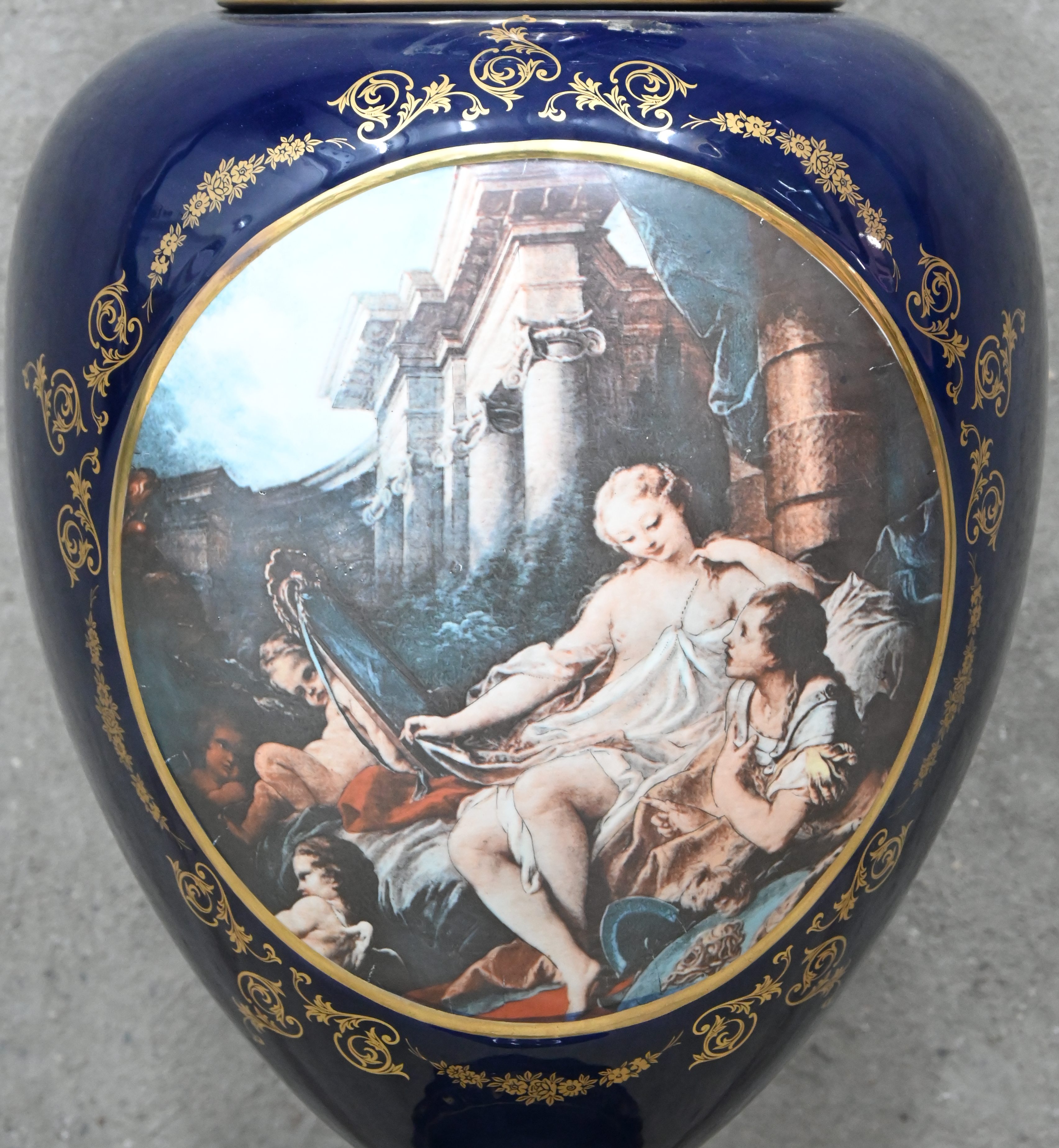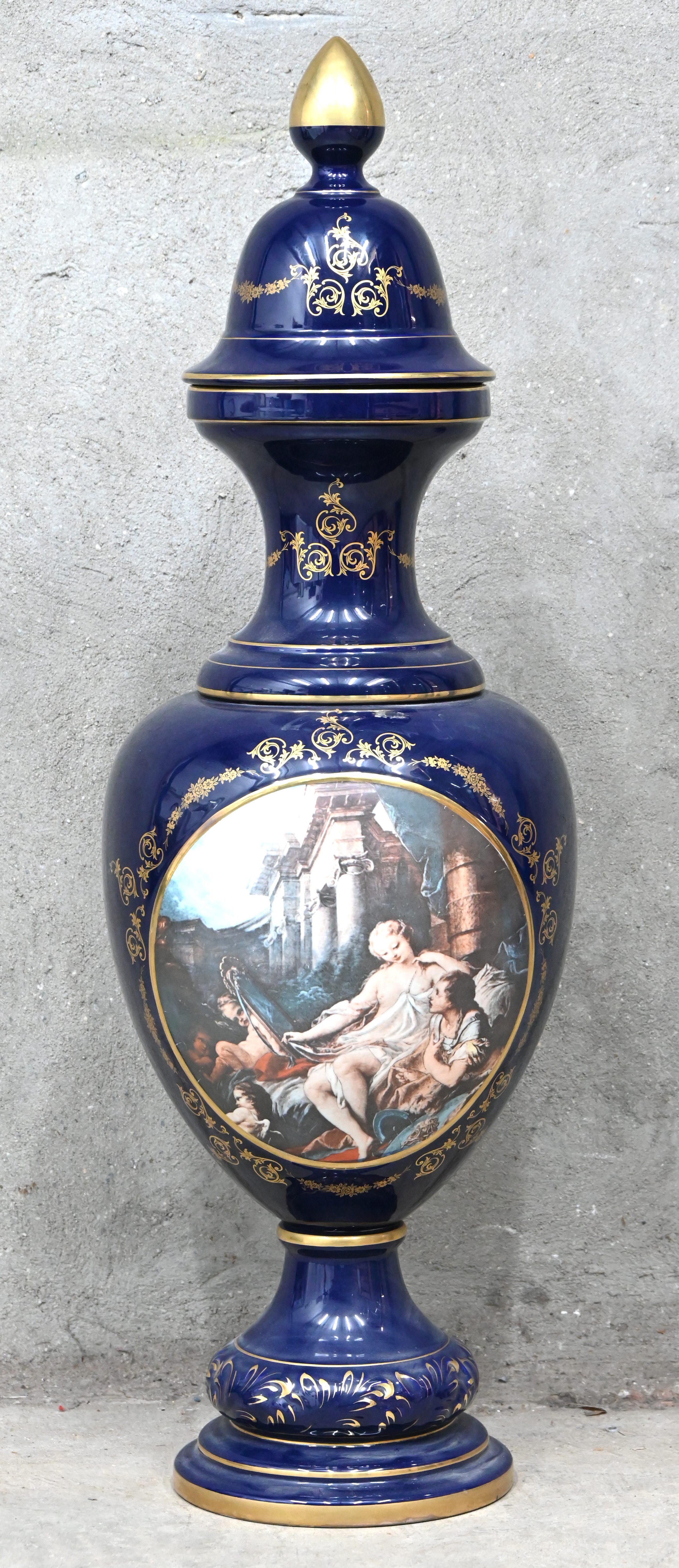 A cobalt blue porcelain lidded vase with a romantic scene and gold paint finish.