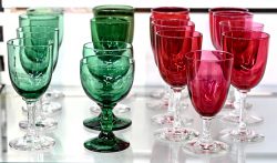 #325Een set van 17 glazen op voet, mondgeblazen. Acht groene en negen rode, vier verschillende modellen.