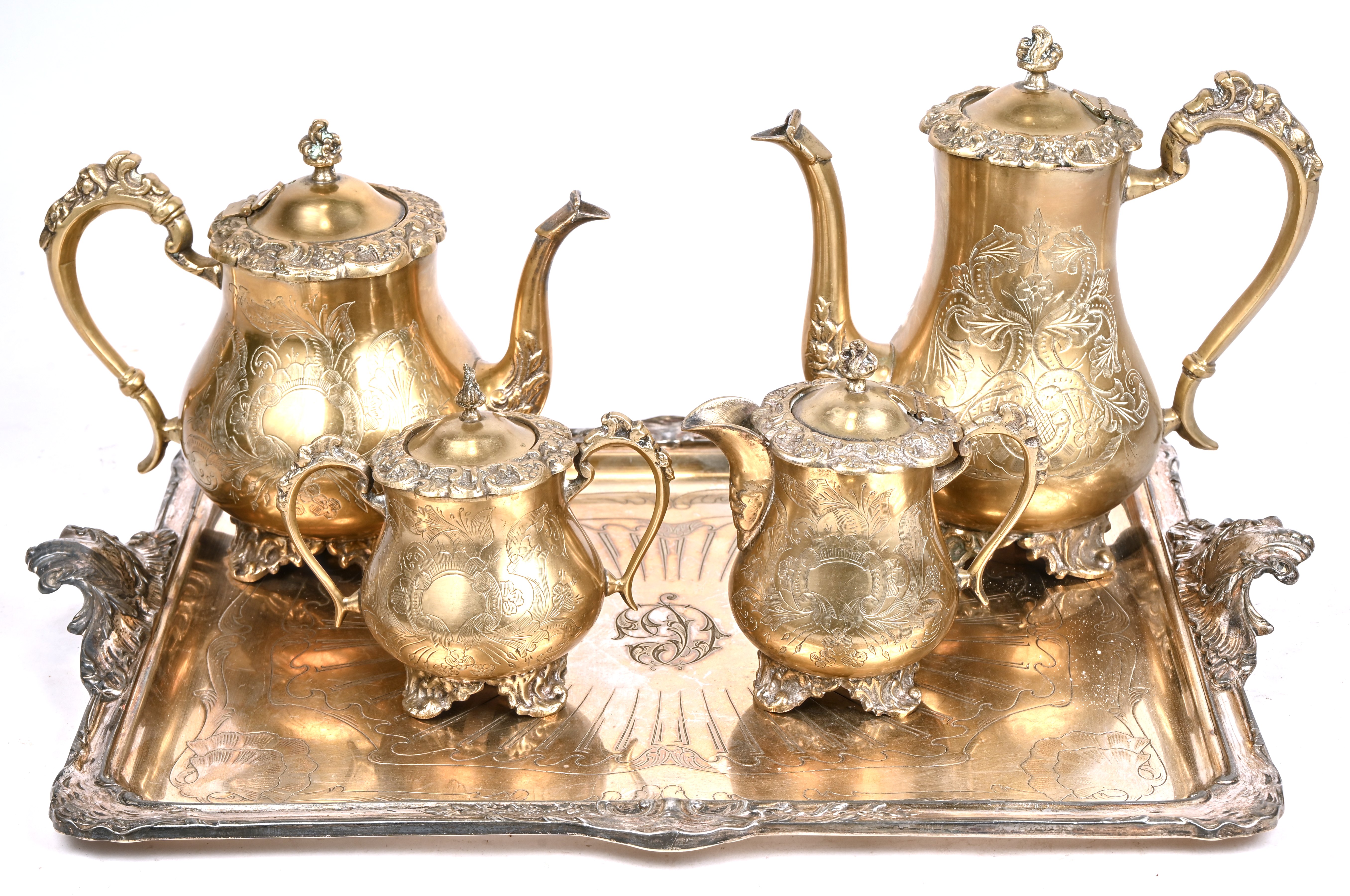 Een koffie-en theeservies van verzilverd metaal. Koffie-, thee-, suiker en melkpot met dienblad, begin XXste eeuw.