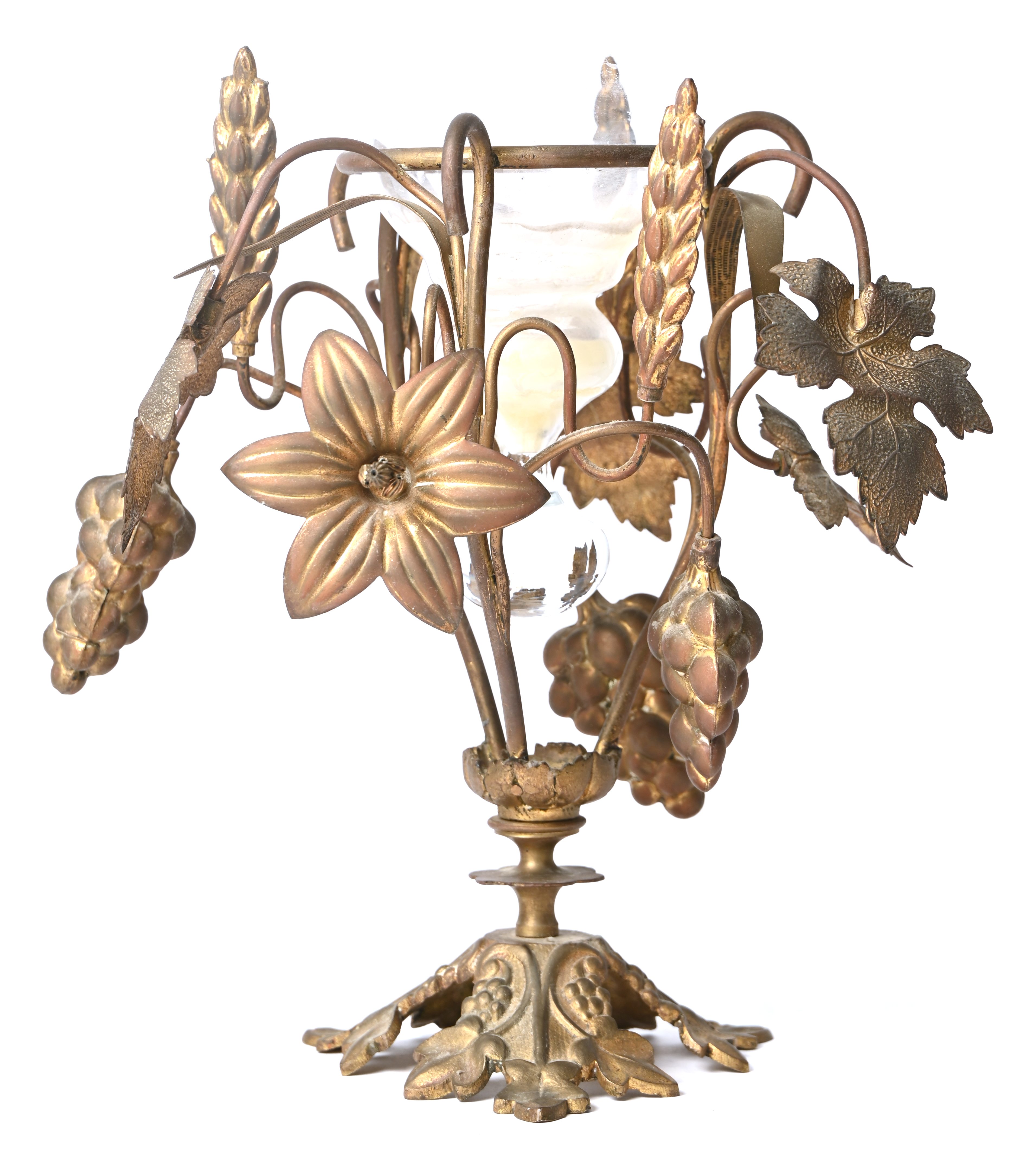 A copper lantern holder with bunches of grapes and ears of grain. Glass insert.