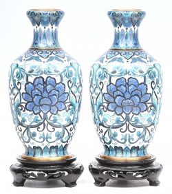 #25Een paar cloisoné vaasjes met bloemen in het decor.