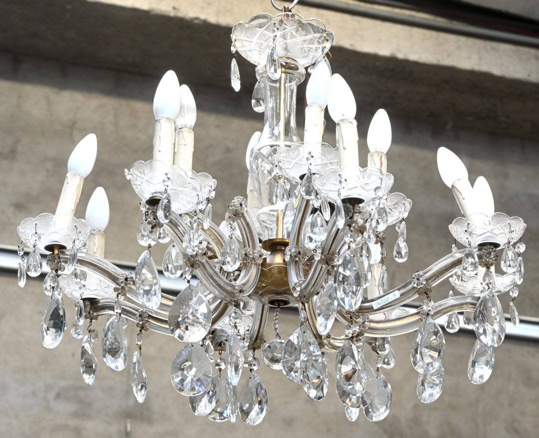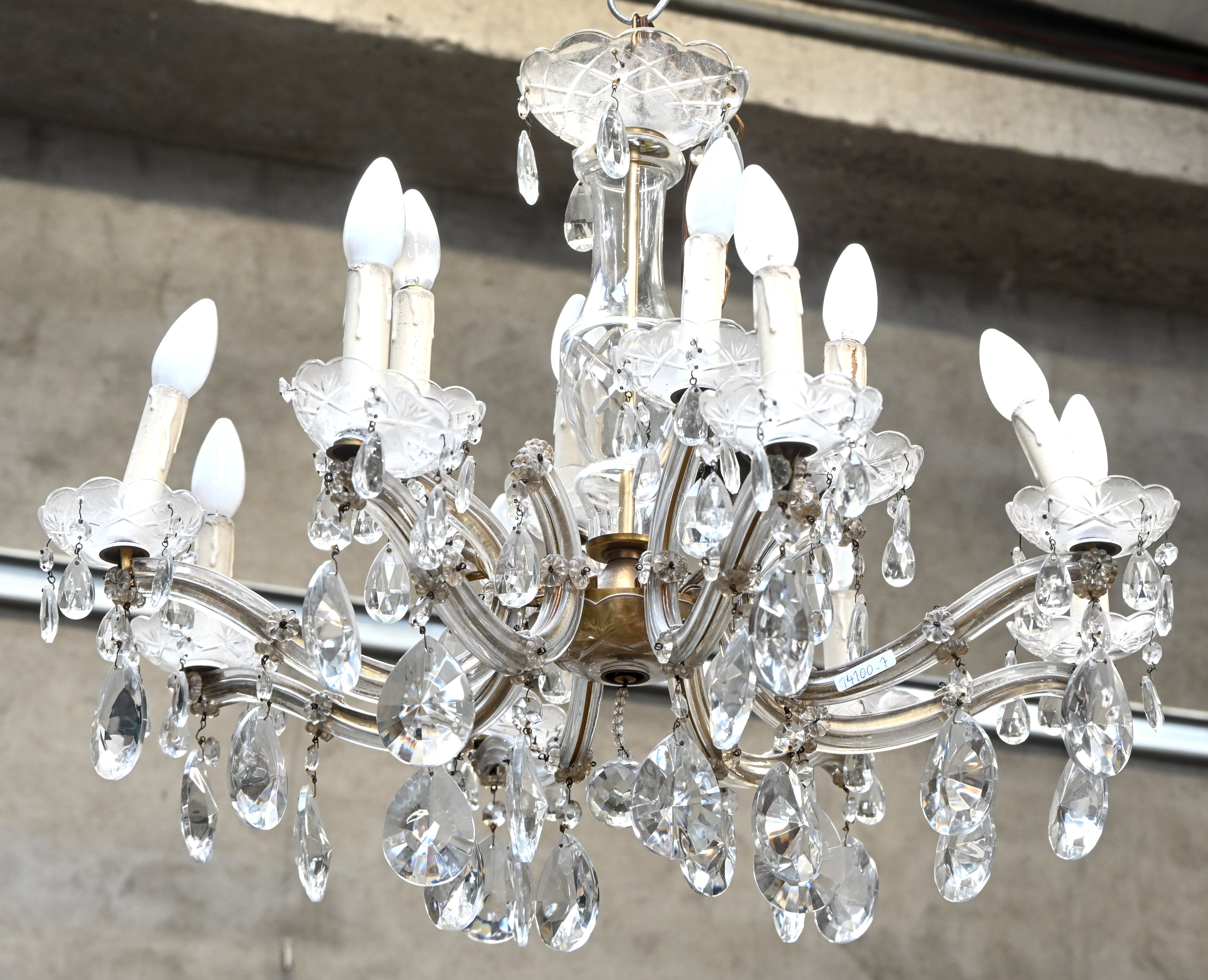 A copper and crystal sac-à-perles chandelier with six arms.No longer availableDim. Hoogte 90, Ø 65 cmEstimate: € 50 / 70 -