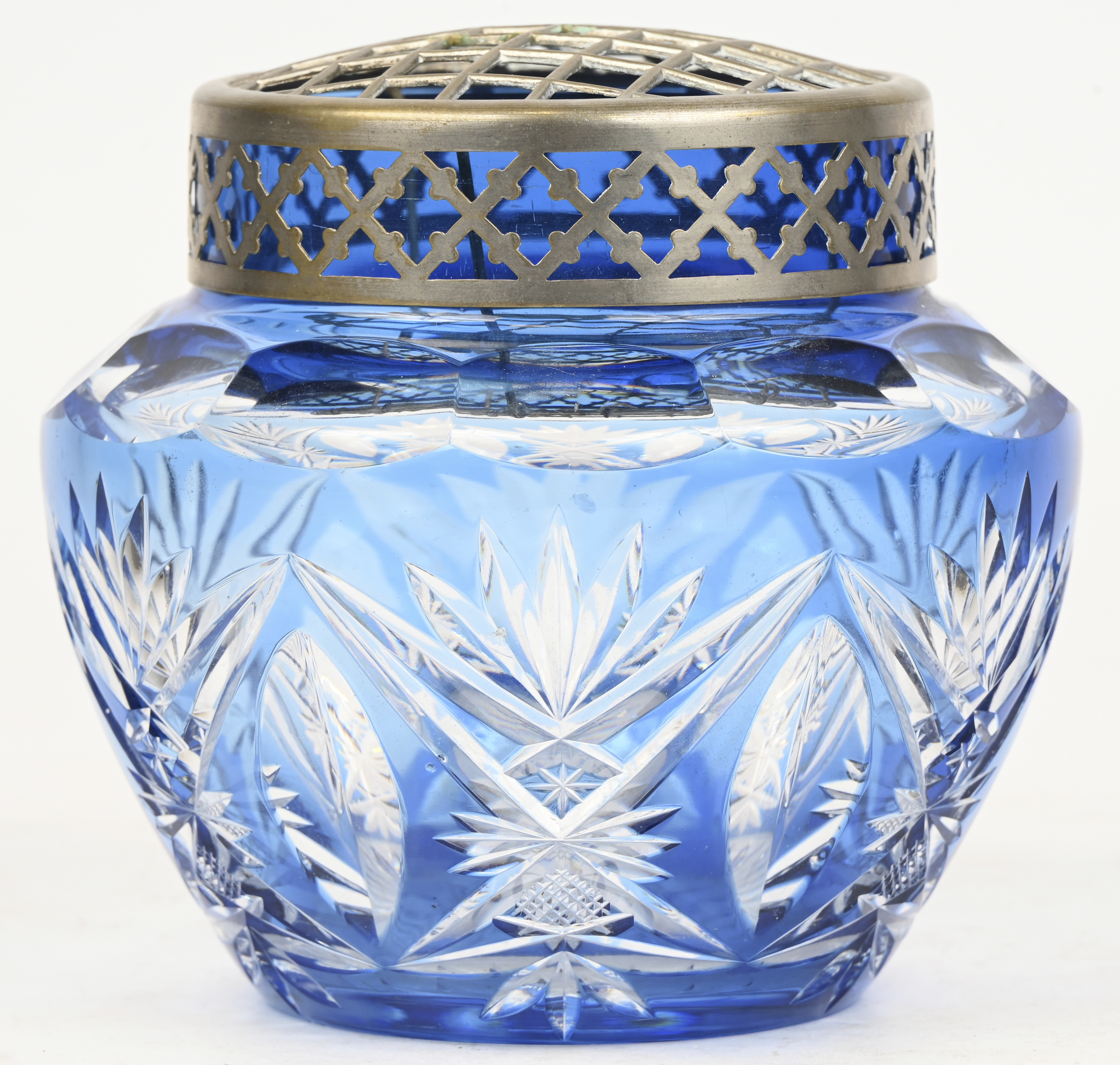 A small posy holder made of cut crystal, partly colored blue in the mass. -