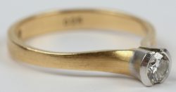 #235Een 18 kt wit en geelgouden ring bezet met een solitair van +- 0,25 ct.