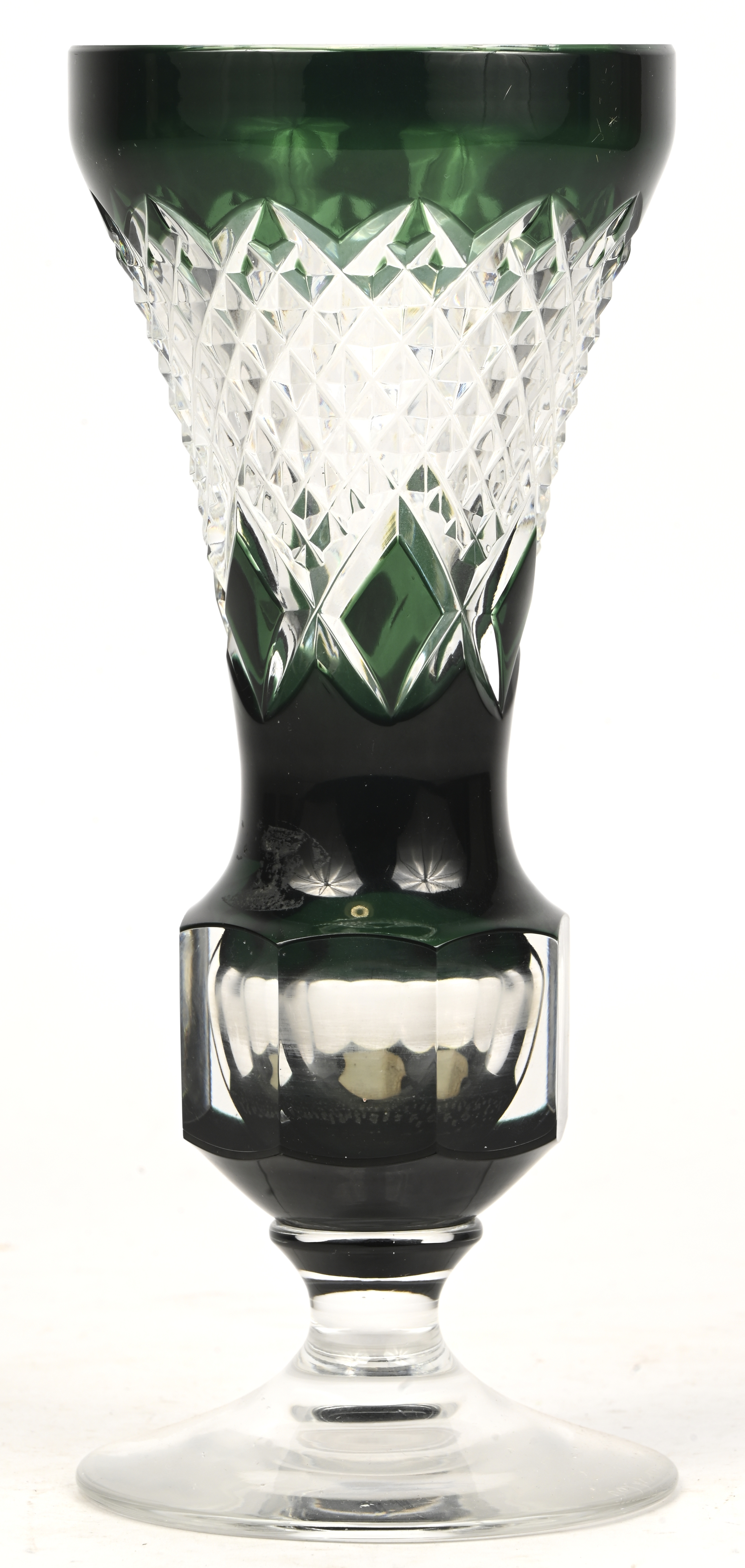 A vase made of cut crystal, colored green in the mass. Marked. -