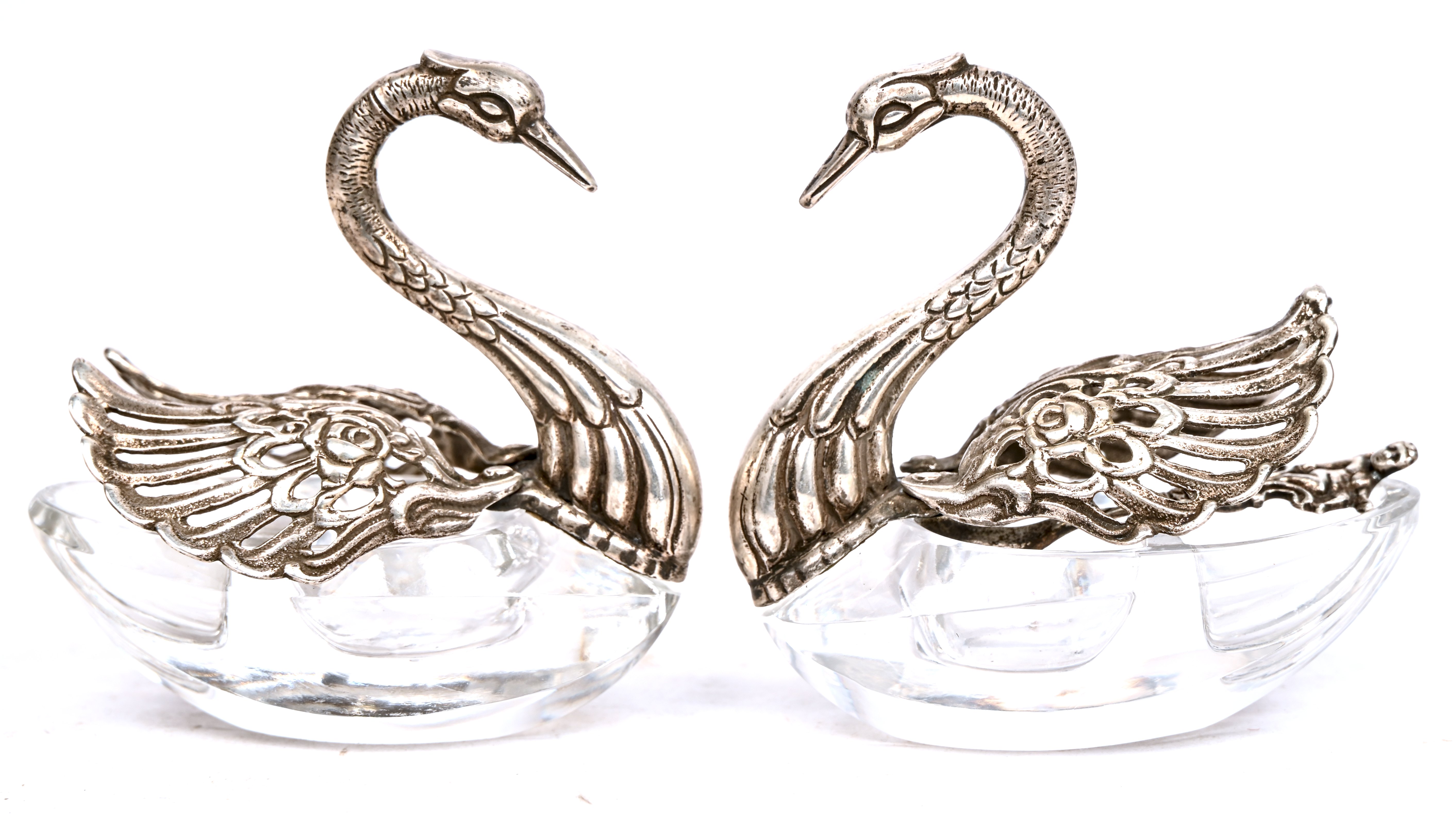 Een kristallen zout en pepervaatje in de vorm van zwanen. Gemerkt 835 zilver. Nek verzwaard.