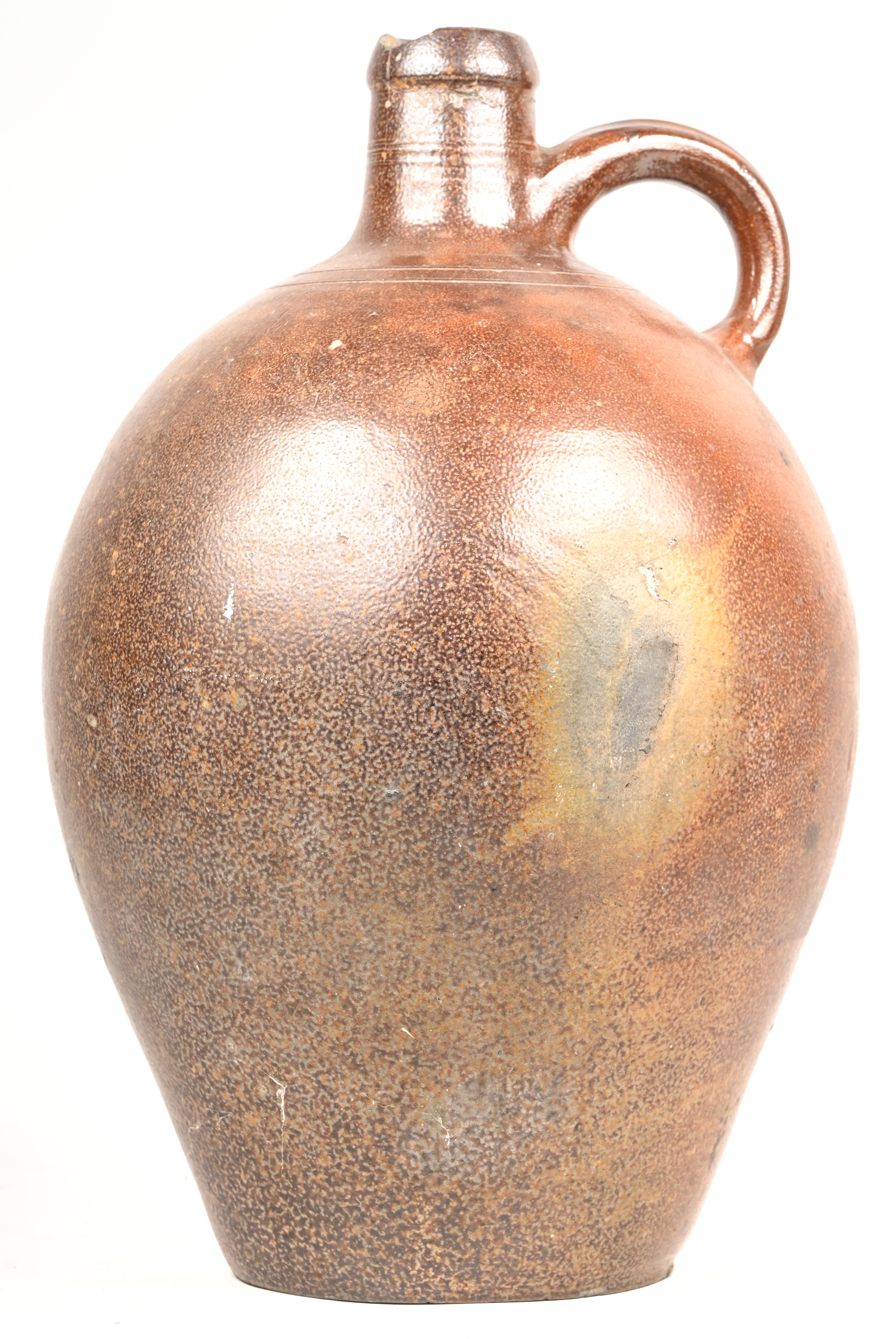 Two vases and one pitcher of Flemish earthenware. Added a German stoneware vase with leaf motifs. -