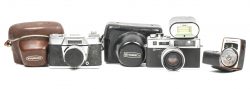#113Een lot van twee oude fototoestellen en toebehoren, bestaande uit: Een Voigtländer Bessamatic met lens: 50/2.5 Color Skopar (Leica 39mm), en een Yashica Electro 35 met lens: Yashinon-DX 1-1.7 45mm. Bijgevoegd een Unittic Harmony lichtmeter en ‘Metz MecaBlitz telecomputer’.