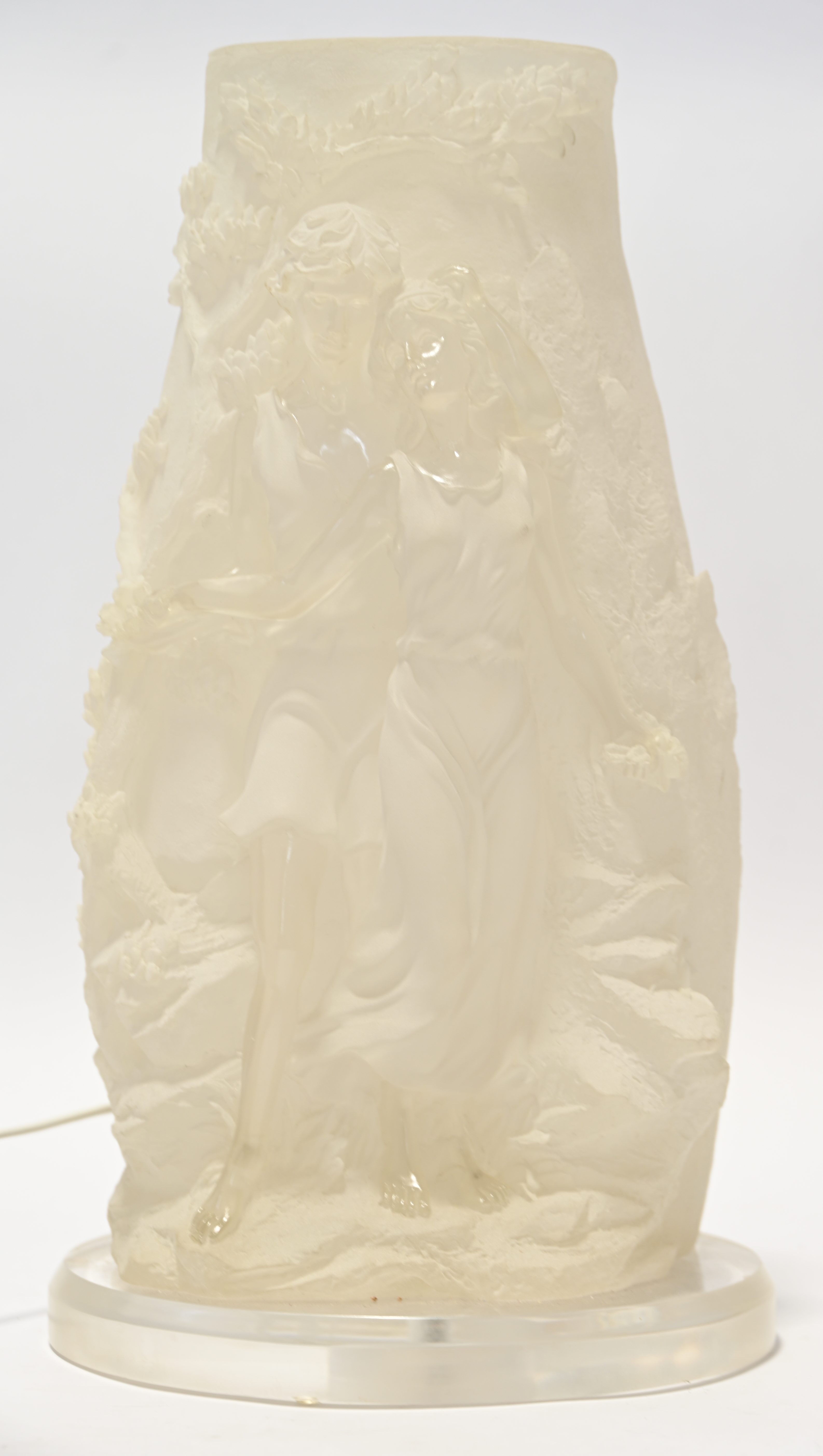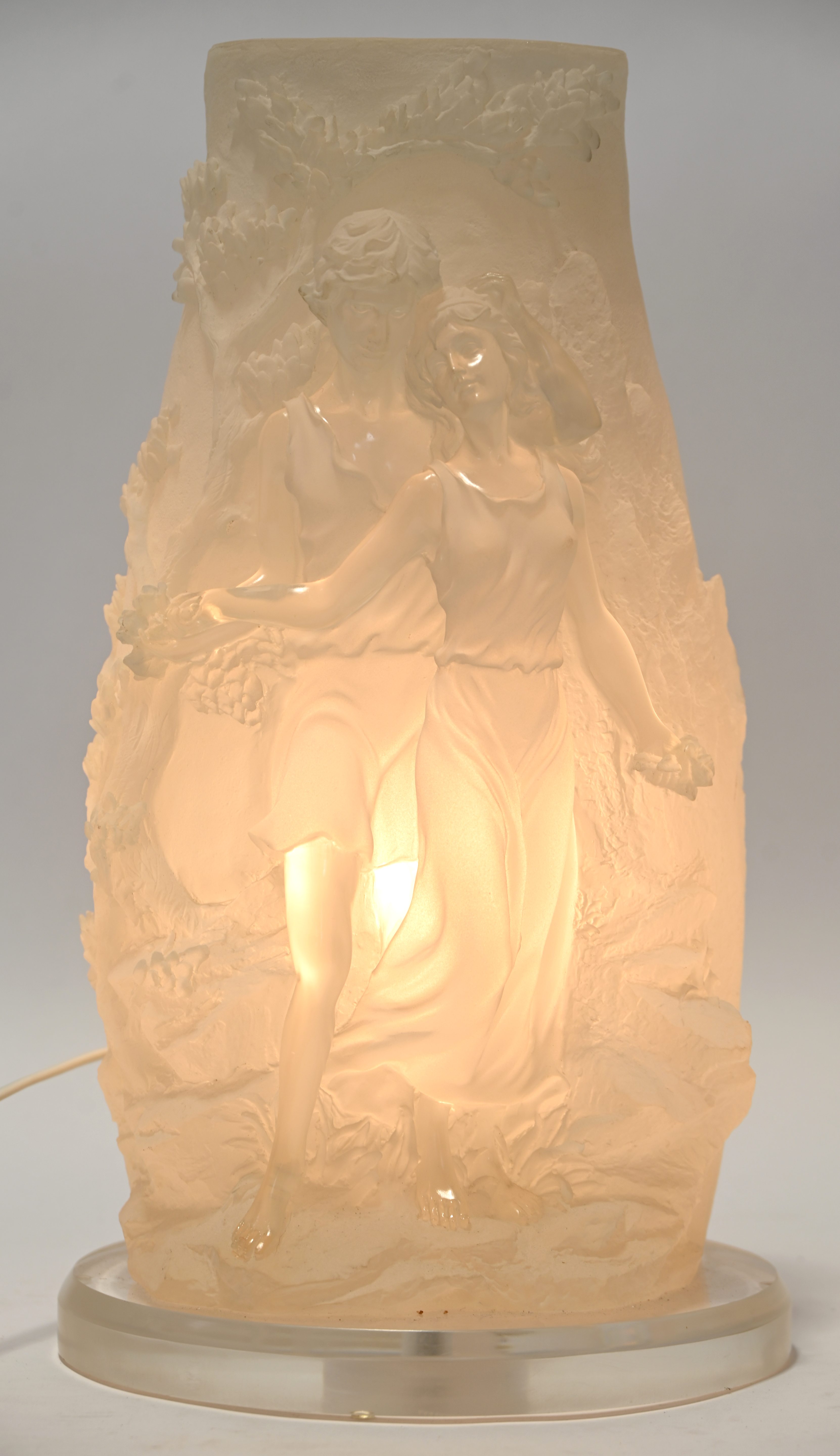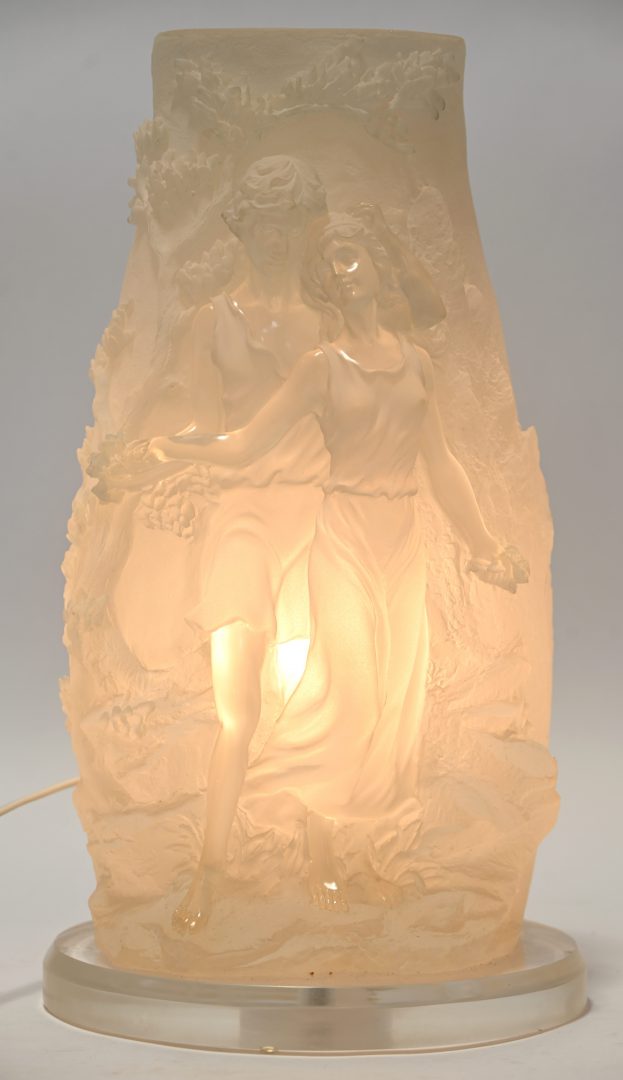 A plastic table lamp decorated with a couple in love, marked Crosa and dated 2000.