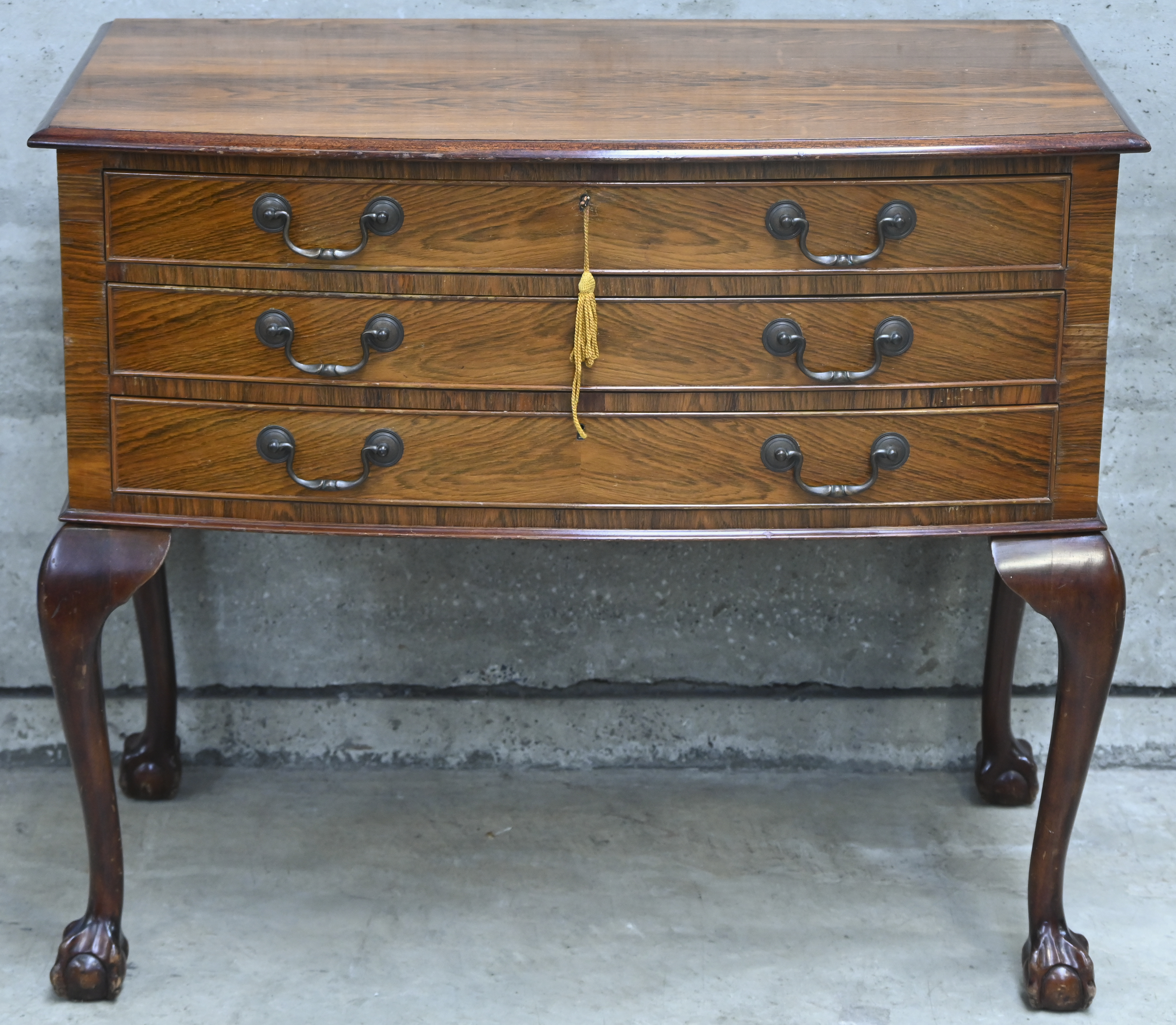 A low walnut cutlery cabinet with claw feet in Georgian style. Three drawers. Gerrard and Company LTD - 112 Regent Street London W1.
