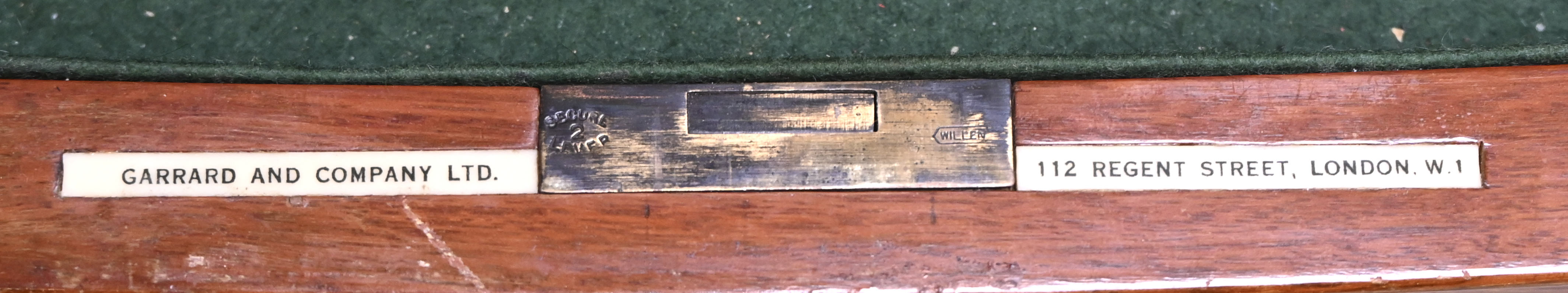 Een laag bestekmeubel van notenhout voorzien van klauwpoten in Georgian stijl. Drie laden. Gerrard and Company LTD - 112 Regent Street London W1.