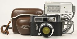 A vintage camera, Voightlander Vito Cl. With an added Braun F26 flash. -