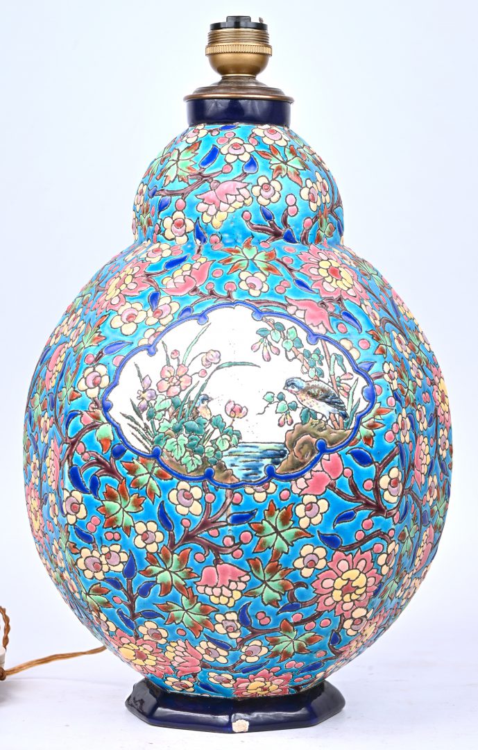 #353LimogesEen handbeschilderde porseleinen dekselvaas, Limoges-France, naar Chinees voorbeels, op houten sokkel.